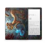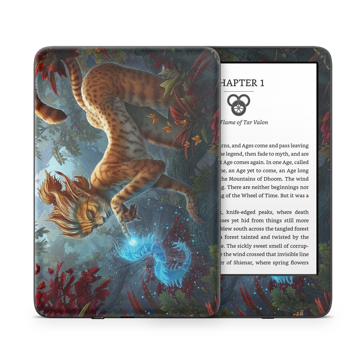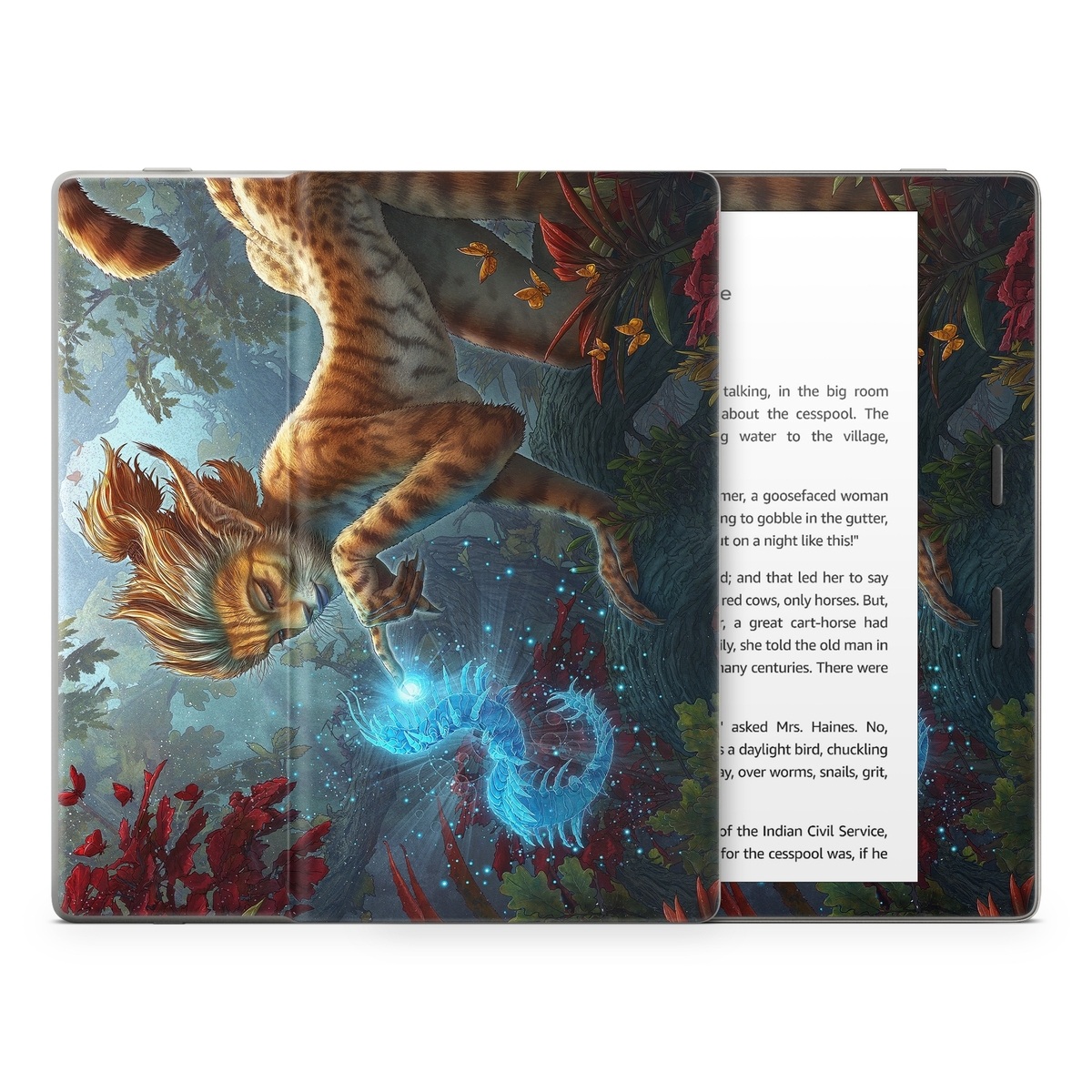 iStyles Amazon Kindle Series Skin design of Fictional character, Mythology, Illustration, Cg artwork, Sky, Organism, Dragon, Felidae, Mythical creature, Art, with yellow, red, black, green, blue colors, and tagged with fantasy, animals, patterns, people, nature, cat, fantasy, forest, nature, woman.