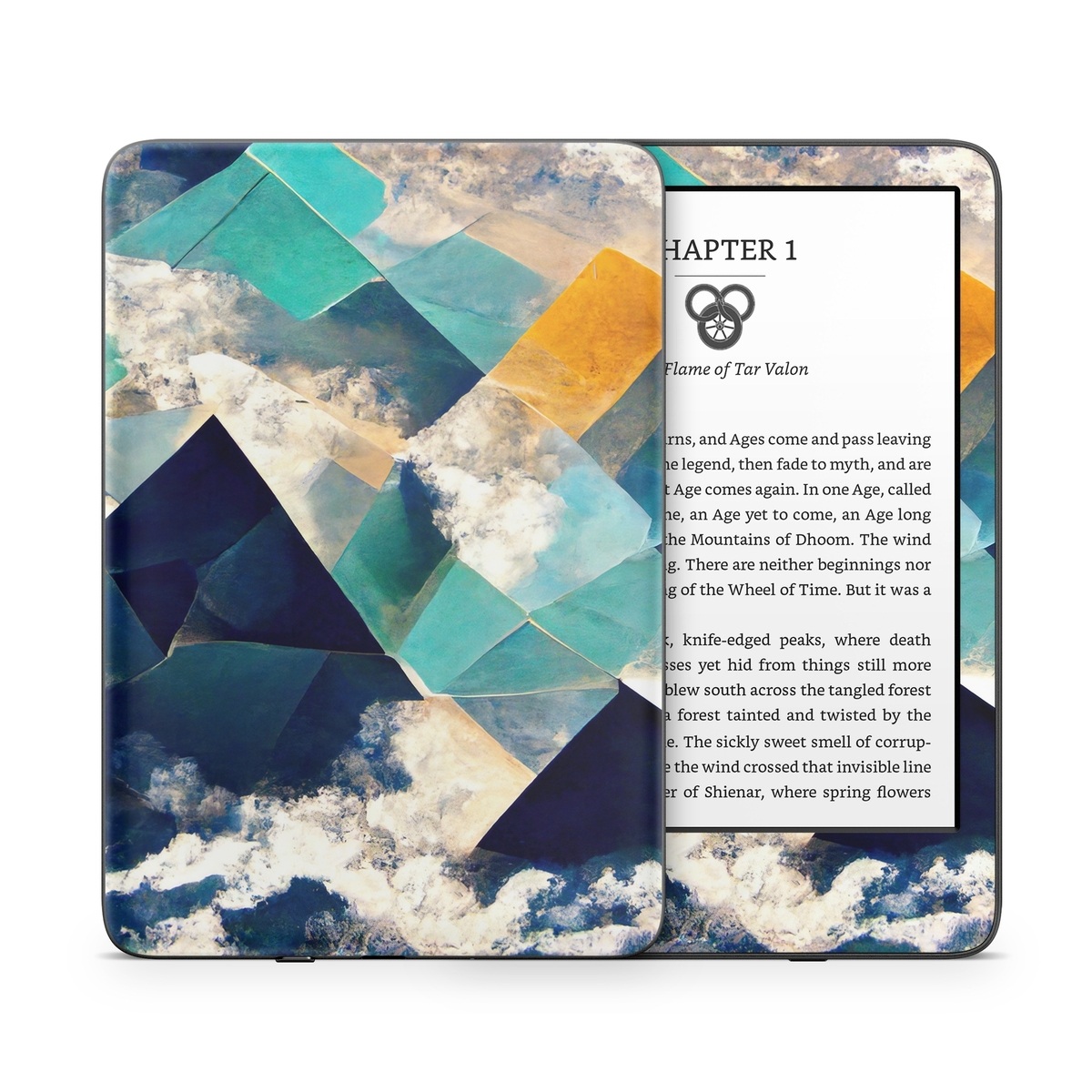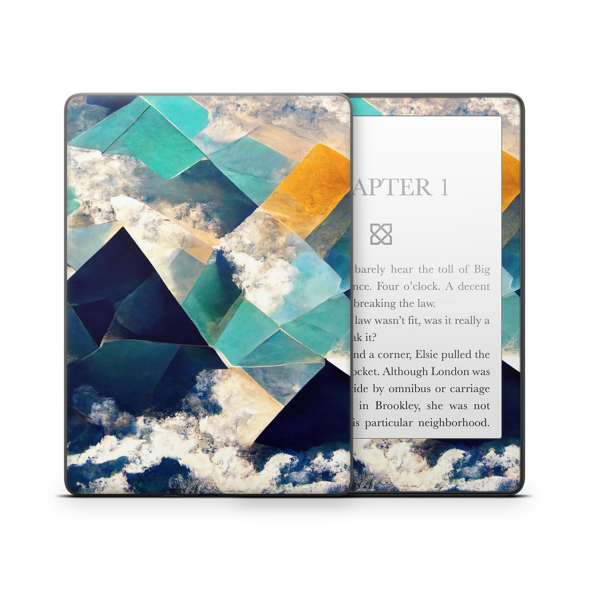 iStyles Amazon Kindle Series Skin design of Daytime, World, Nature, Blue, Azure, Green, Triangle, Rectangle, Architecture, Art, with blue, yellow, white, green colors, and tagged with abstract, nature, blue, clouds, geometric, gold, green, ocean, shapes, sky, water.