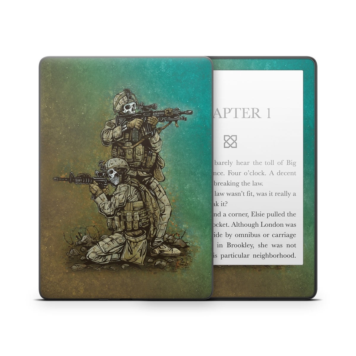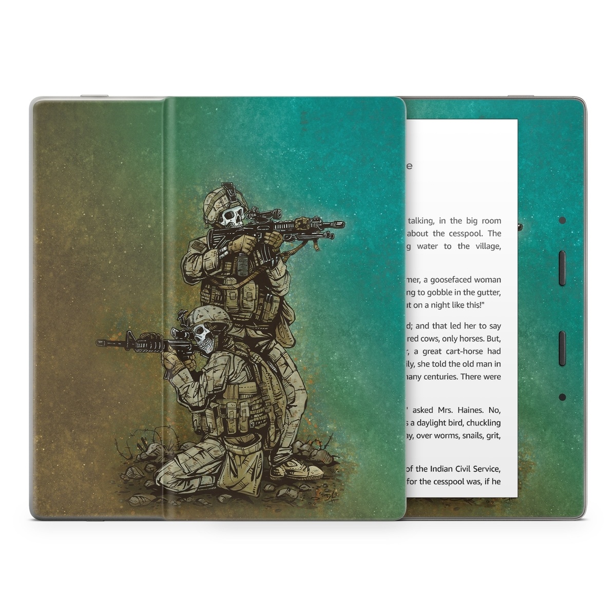 iStyles Amazon Kindle Series Skin design of Art, Sculpture, Landscape, Illustration, Visual arts, Wood, Drawing, Fictional character, Soil, Circle, with blue, green, white, gray, brown colors, and tagged with skulls, military, objects, military, guns, buddy.