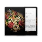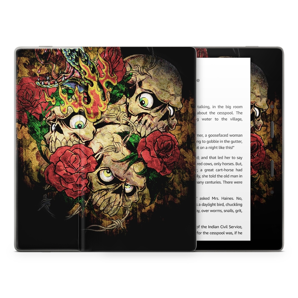 iStyles Amazon Kindle Series Skin design of Illustration, Bouquet, Art, Skull, Plant, Rose, Flower, Graphic design, Fictional character, Floral design, with black, red, green, gray colors, and tagged with skulls, flowers, animals, bones, grunge, roses, skull, snake.