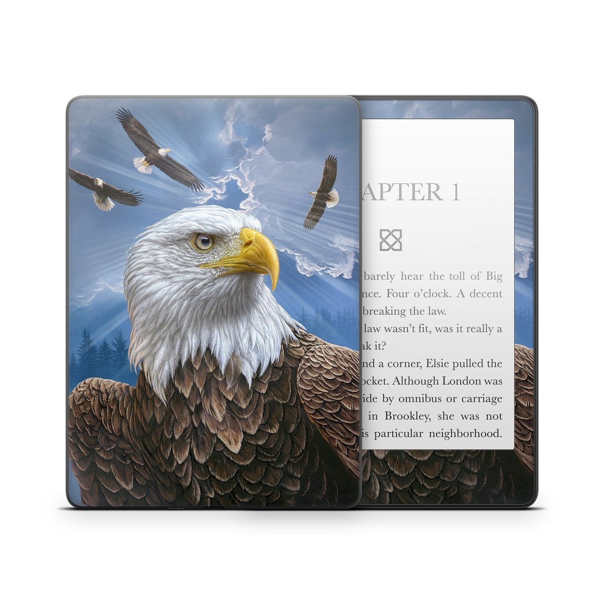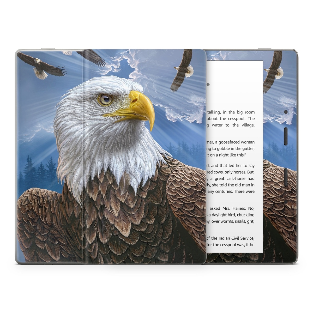 iStyles Amazon Kindle Series Skin design of Bird, Bald eagle, Bird of prey, Vertebrate, Accipitriformes, Accipitridae, Eagle, Nature, Beak, Kite, with blue, brown, white, yellow colors, and tagged with animals, nature, america, animals, birds, eagle, nature.