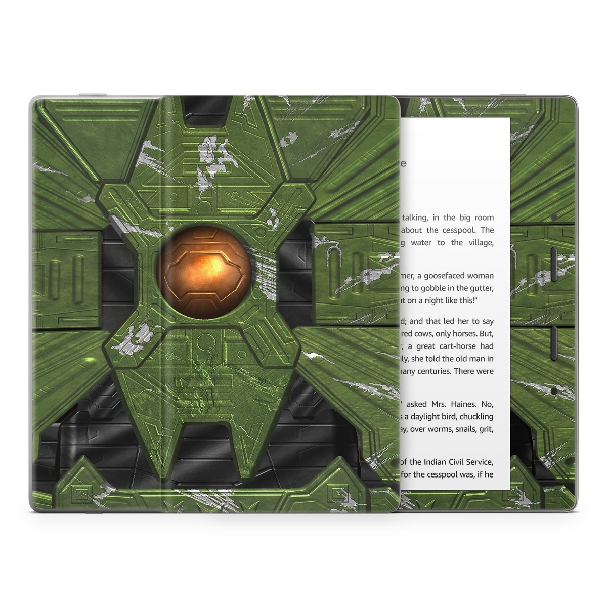 iStyles Amazon Kindle Series Skin design of Green, Fictional character, Games, Fiction, Pc game, Illustration, Strategy video game, Digital compositing, Art, Screenshot, with green, yellow, orange, black colors, and tagged with space.