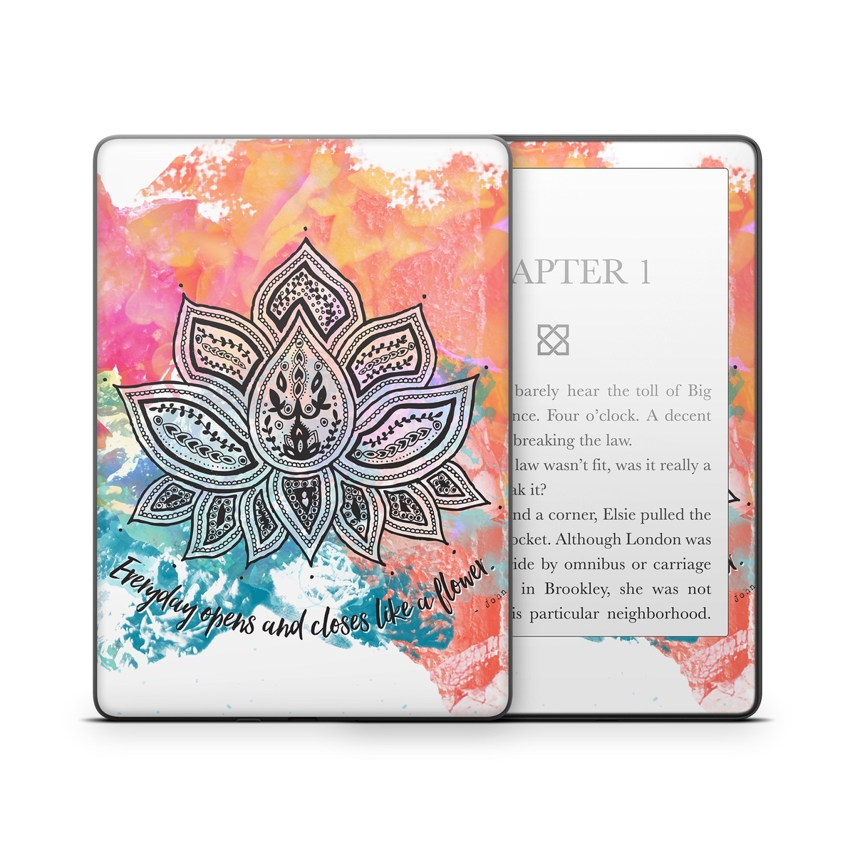 iStyles Amazon Kindle Series Skin design of Pink, Leaf, Pattern, Design, Graphic design, Illustration, Symmetry, Visual arts, Art, Plant, with orange, yellow, red, blue, green, black colors, and tagged with signs, flowers, colorful, flower, lotus.
