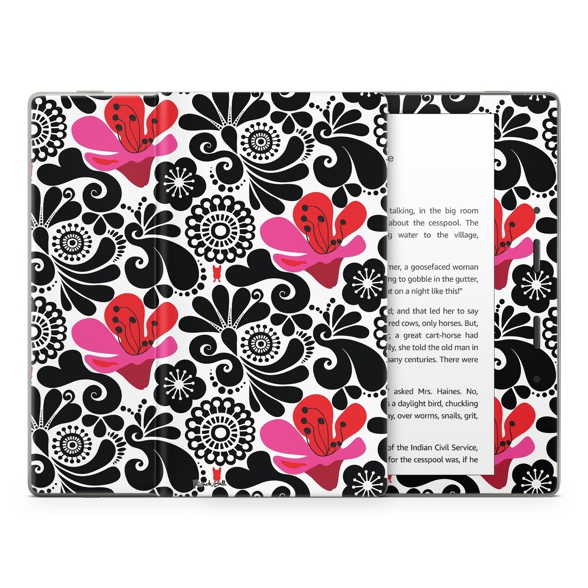 iStyles Amazon Kindle Series Skin design of White, Product, Green, Botany, Petal, Textile, Pink, Creative arts, Line, Magenta, with black, white, pink, red colors, and tagged with patterns, flowers, black, blackandwhite, floral, flower, flowers, paisley, white.