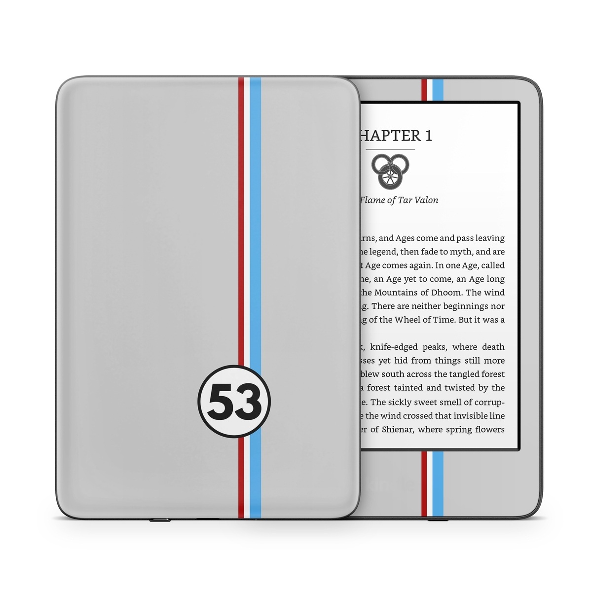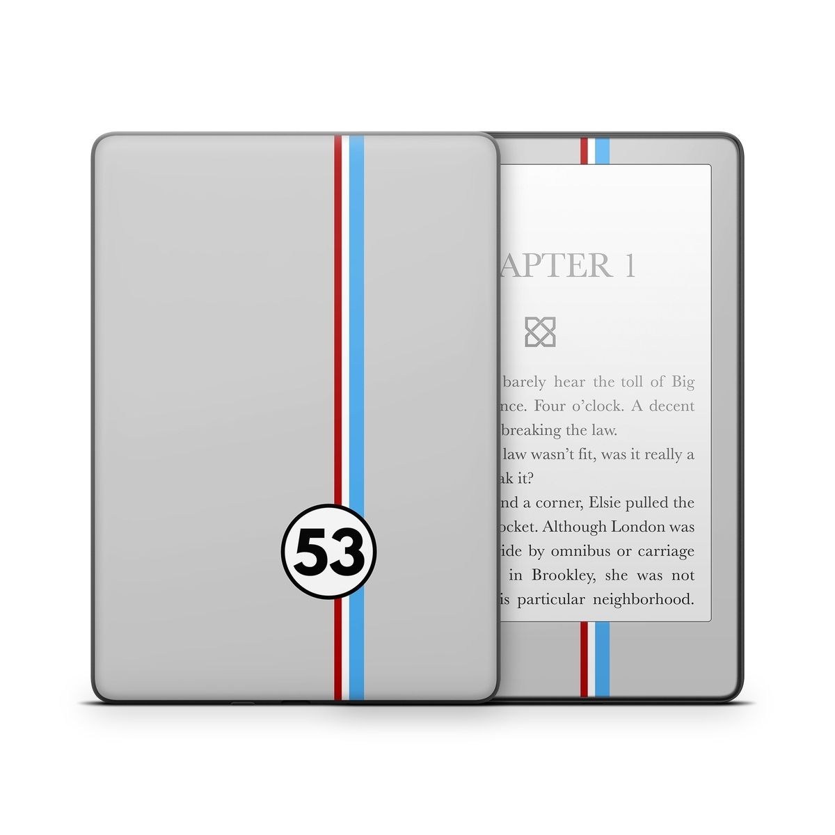 iStyles Amazon Kindle Series Skin design of Line, Sign, Games, with gray, blue, red, white, black colors, and tagged with lookslike, signs, racing, racer, 53, fifty, three.