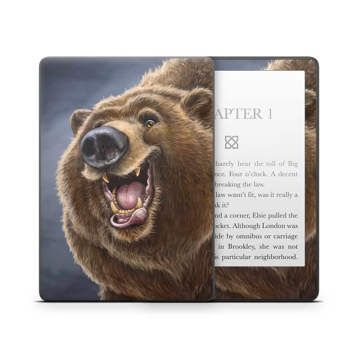 iStyles Amazon Kindle Series Skin design of Brown bear, Kodiak bear, Carnivore, Grizzly bear, Terrestrial animal, Snout, Bear, Whiskers, Fur, Fang, with brown, black, white, pink, gray colors, and tagged with fineart, animals, smiling, brown, bear.