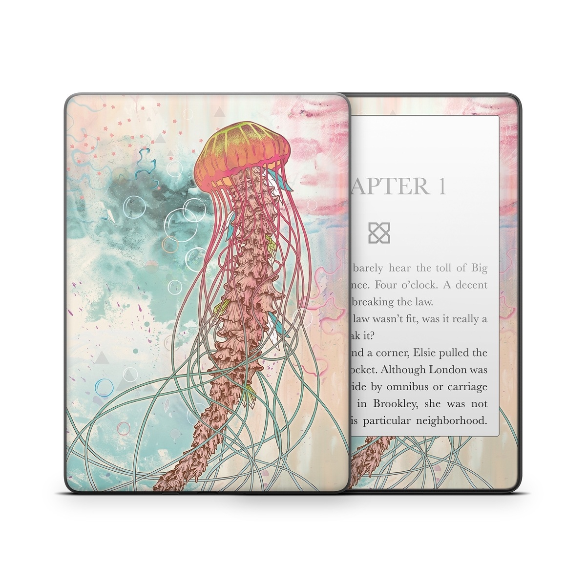 iStyles Amazon Kindle Series Skin design of Jellyfish, Illustration, Water, Cnidaria, Marine invertebrates, Organism, Portuguese man o' war, Art, Nepenthes, Invertebrate, with gray, pink, yellow, red, green colors, and tagged with animals, abstract, animals, aquatic, bubbles, jellyfish, ocean, sea, sketch.