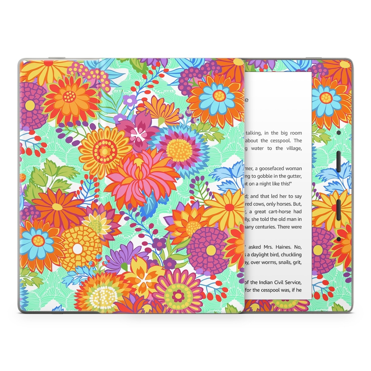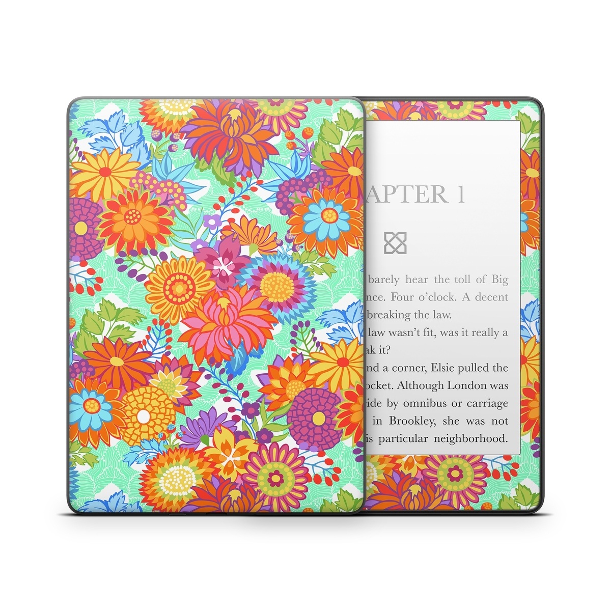 iStyles Amazon Kindle Series Skin design of Pattern, Floral design, Orange, Flower, Design, Textile, Plant, Wildflower, Wrapping paper, Visual arts, with gray, orange, green, purple colors, and tagged with patterns, flowers, bright, carnival, floral, flowers, fuchsia, green, orange, pattern, pink, yellow.