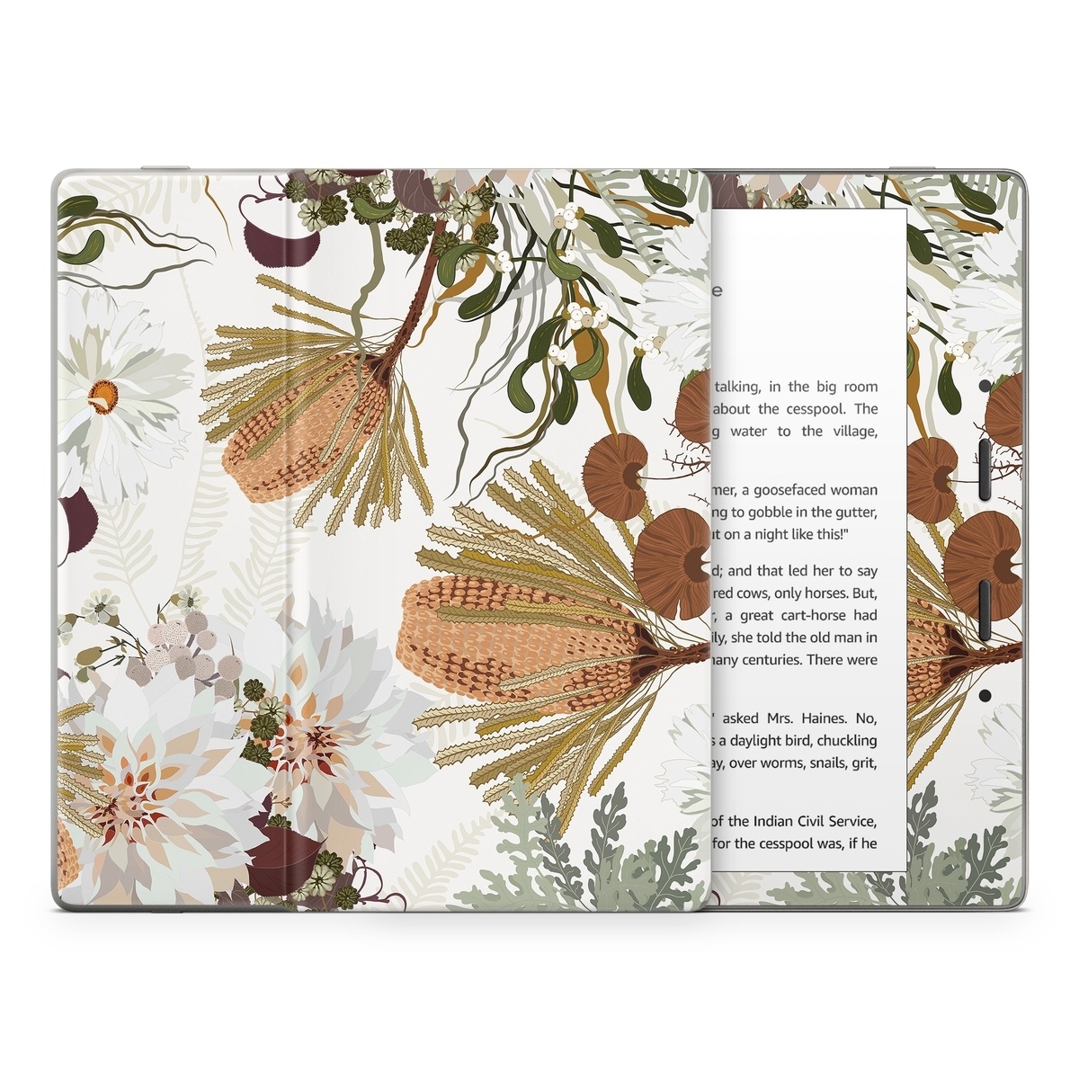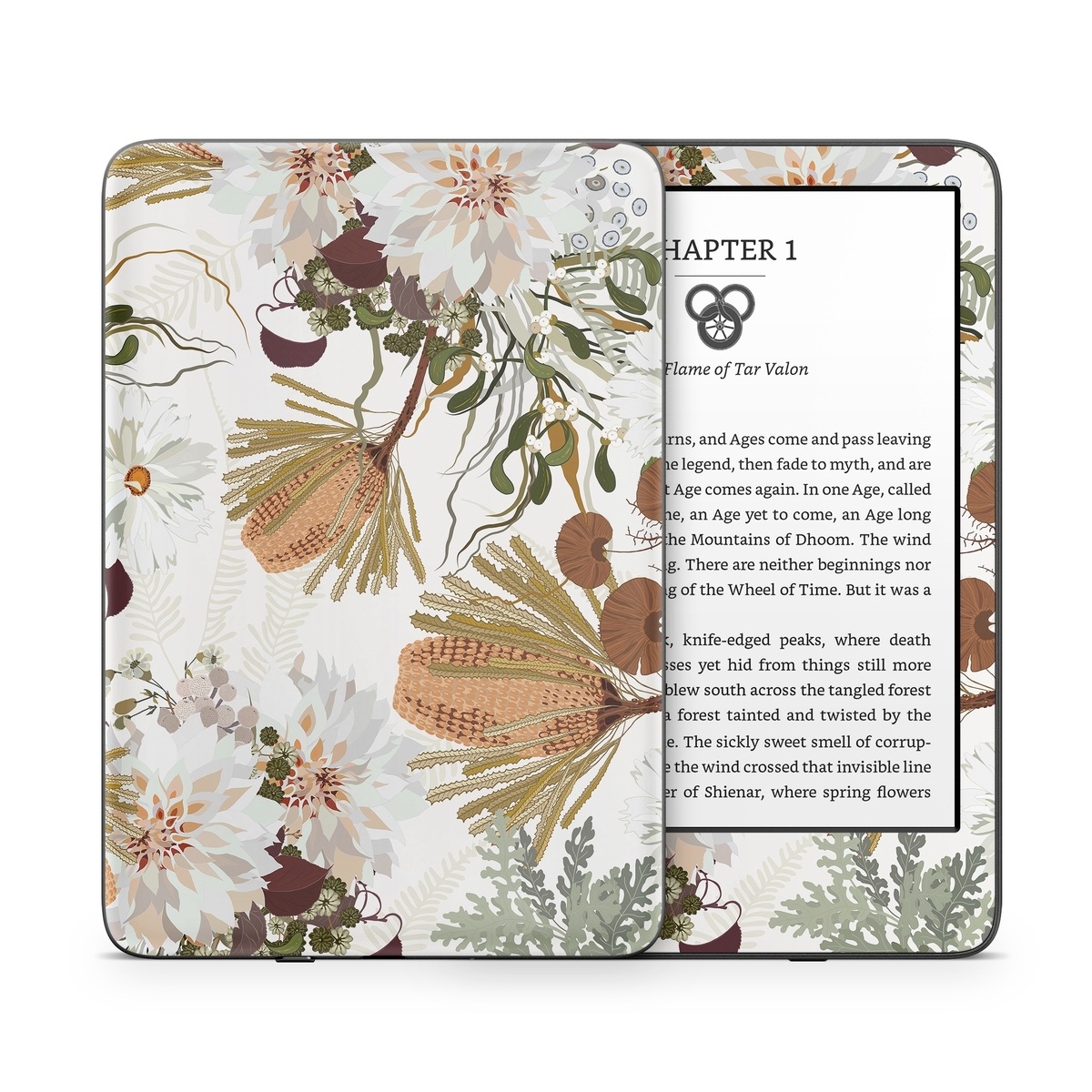 iStyles Amazon Kindle Series Skin design of Flower, Botany, Plant, Floral design, Wildflower, Pattern, Wallpaper, Textile, Petal, Butterfly, with white, brown, green, gray colors, and tagged with nature, patterns, flowers, brown, cream, filigree, floral, flower, flowers, green, leaf, leaves, nature, neutral, outdoor.