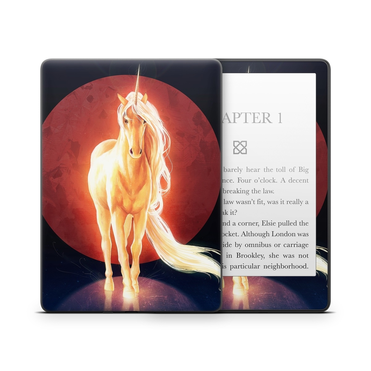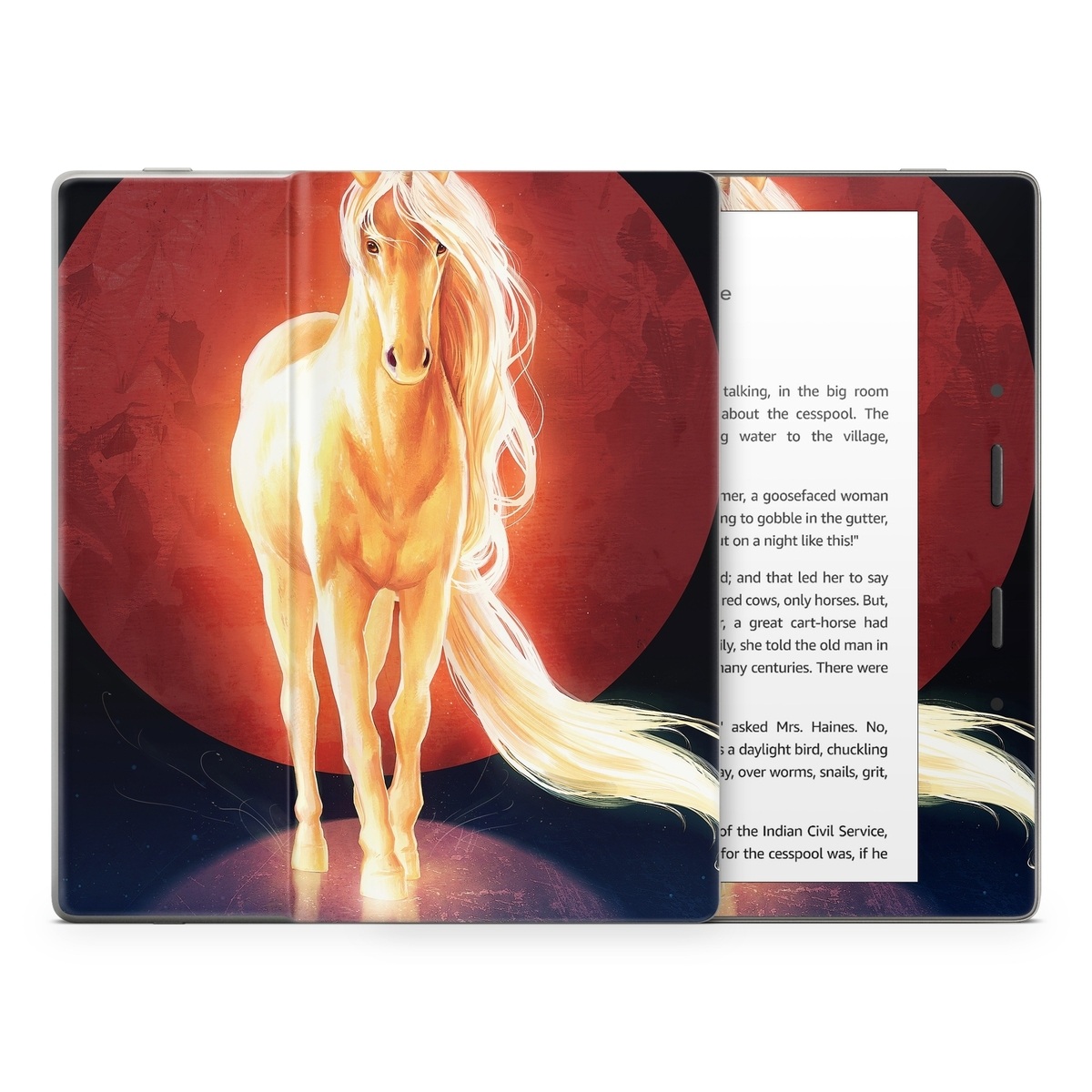 iStyles Amazon Kindle Series Skin design of Hair, Horse, Human body, Jaw, Art, Entertainment, Heat, Neon, Flame, Tail, with black, red, orange, yellow, white, purple colors, and tagged with animals, space, fantasy, glowing, moon, orange, sky, unicorn, yellow.