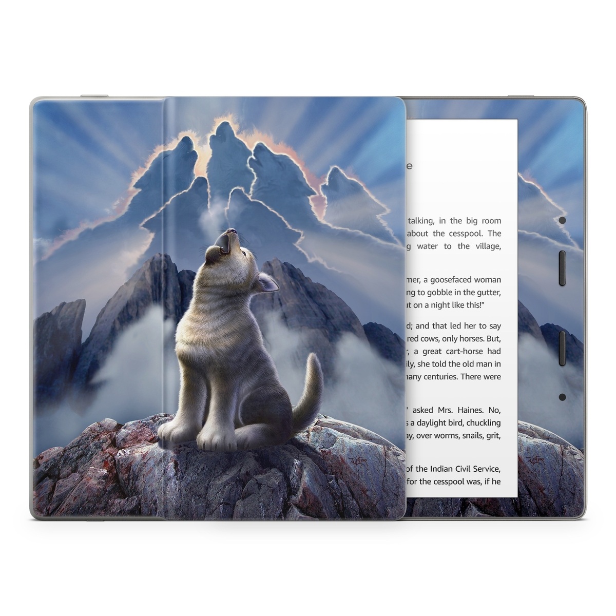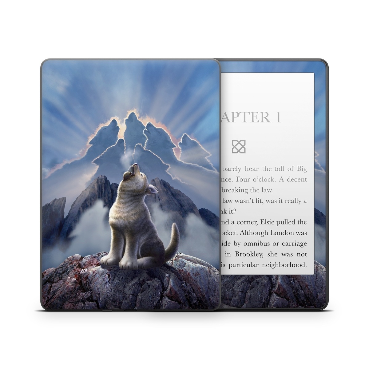 iStyles Amazon Kindle Series Skin design of Sky, Cloud, Atmosphere, Rock, Wolf, Photography, Cg artwork, Illustration, Mountain, Mythology, with white, blue, gray, brown colors, and tagged with animals, nature, animals, dogs, pack, wolf, wolves.