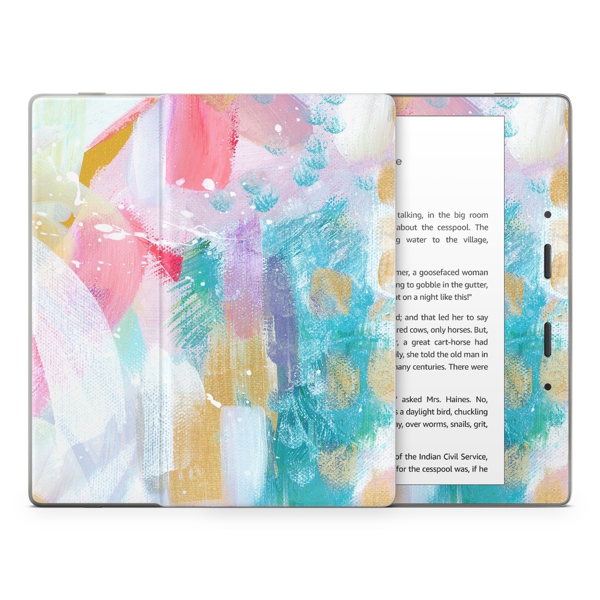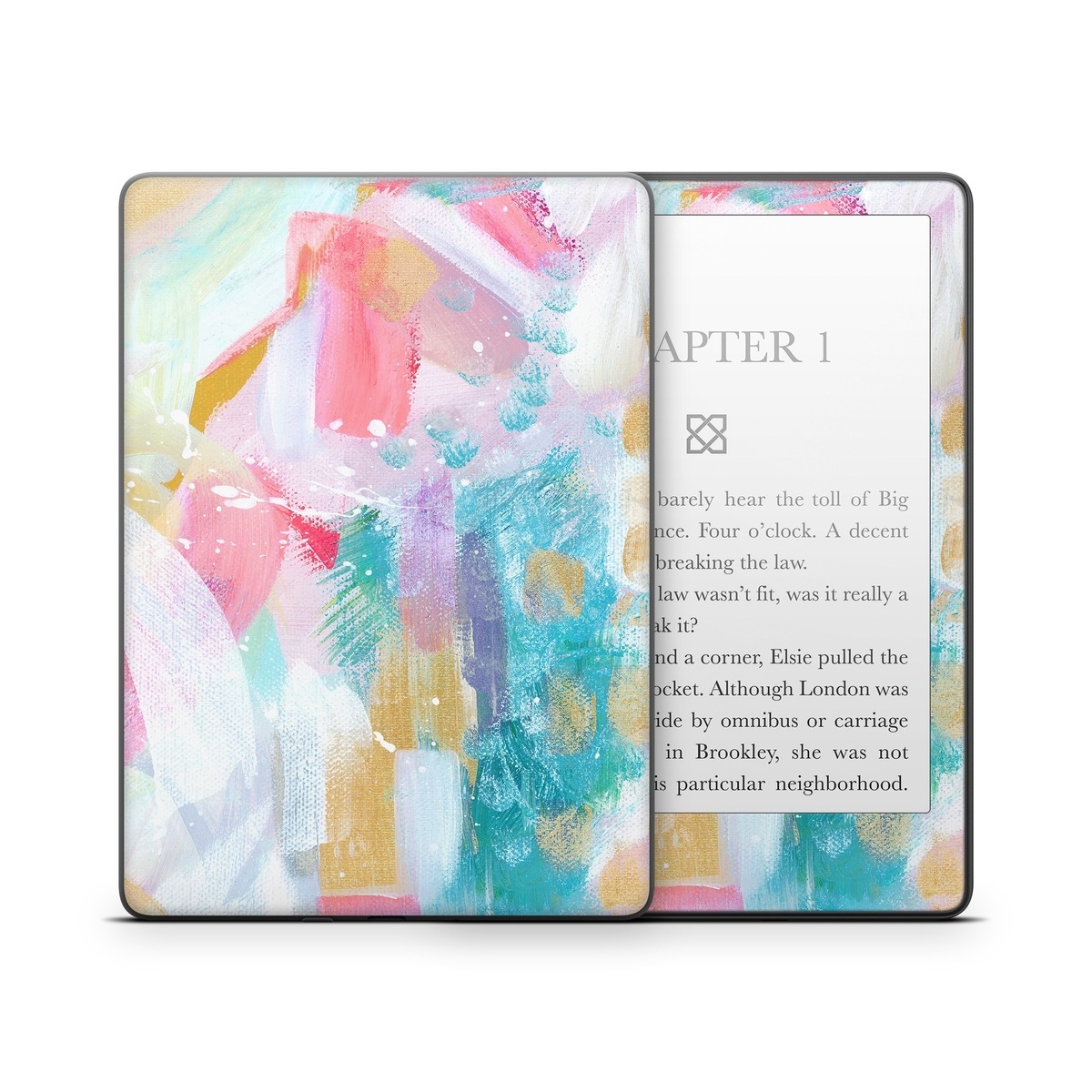 iStyles Amazon Kindle Series Skin design of Colorfulness, Art paint, Paint, Pink, Creative arts, Art, Aqua, Magenta, Tints and shades, Font, with white, blue, pink, purple, green, yellow colors, and tagged with abstract, absrtact, brush, brushstrokes, gold, paint, painting, pastel, splatter, stamps.