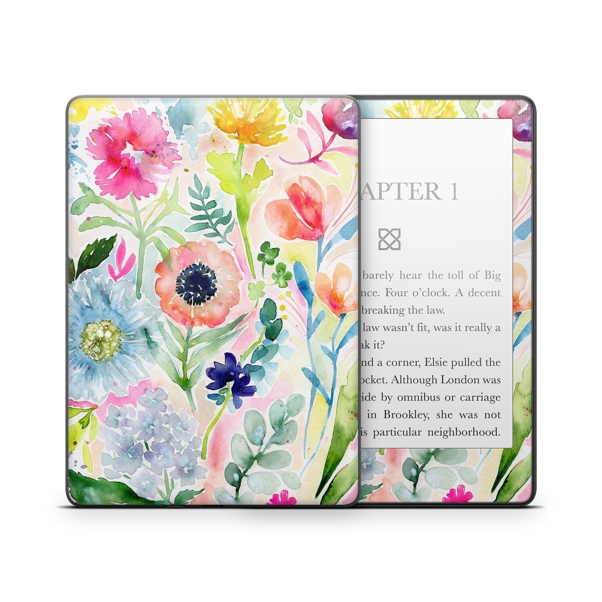 iStyles Amazon Kindle Series Skin design of Flower, Watercolor paint, Plant, Flowering plant, Pattern, Floral design, Botany, Petal, Wildflower, Design, with green, pink, yellow, orange, blue, red, purple colors, and tagged with flowers, patterns, floral, flowers, garden, paint, painting, watercolor.