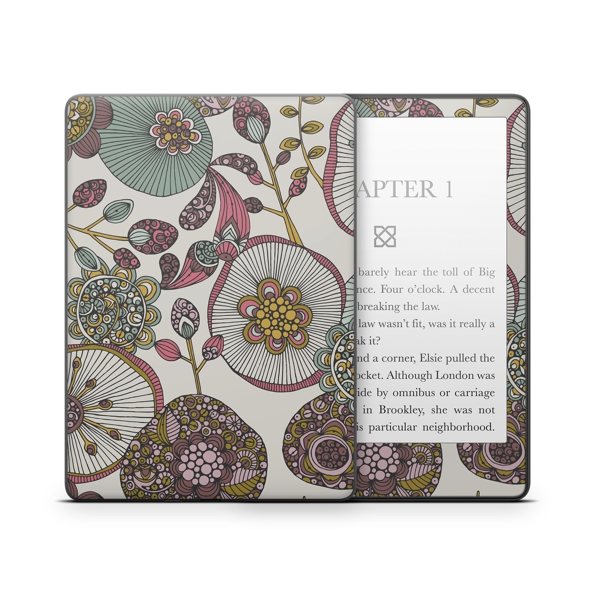 iStyles Amazon Kindle Series Skin design of Pattern, Textile, Botany, Visual arts, Motif, Design, Needlework, Circle, Floral design, with gray, pink, green, blue, purple colors, and tagged with flowers, patterns, flowers, lotus, monochromatic, mute, pattern.