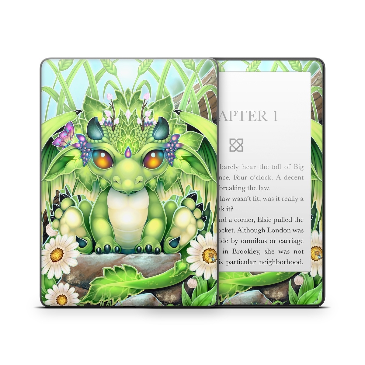 iStyles Amazon Kindle Series Skin design of Plant, Green, Leaf, Natural environment, Flower, Terrestrial plant, Grass, Creative arts, People in nature, Art, with green, white, yellow, brown, blue colors, and tagged with fantasy, animals, flowers, nature, dragon, wings, horns.