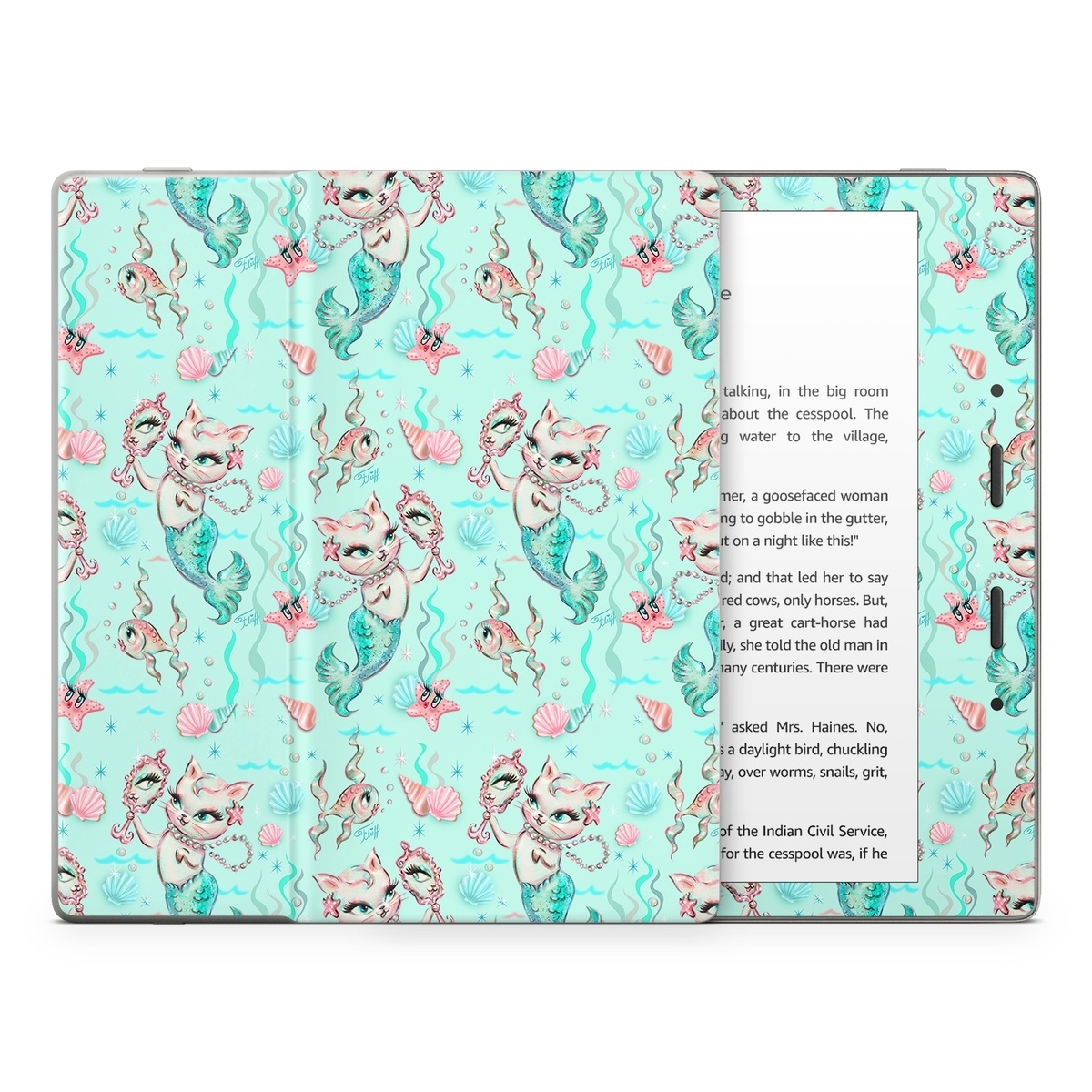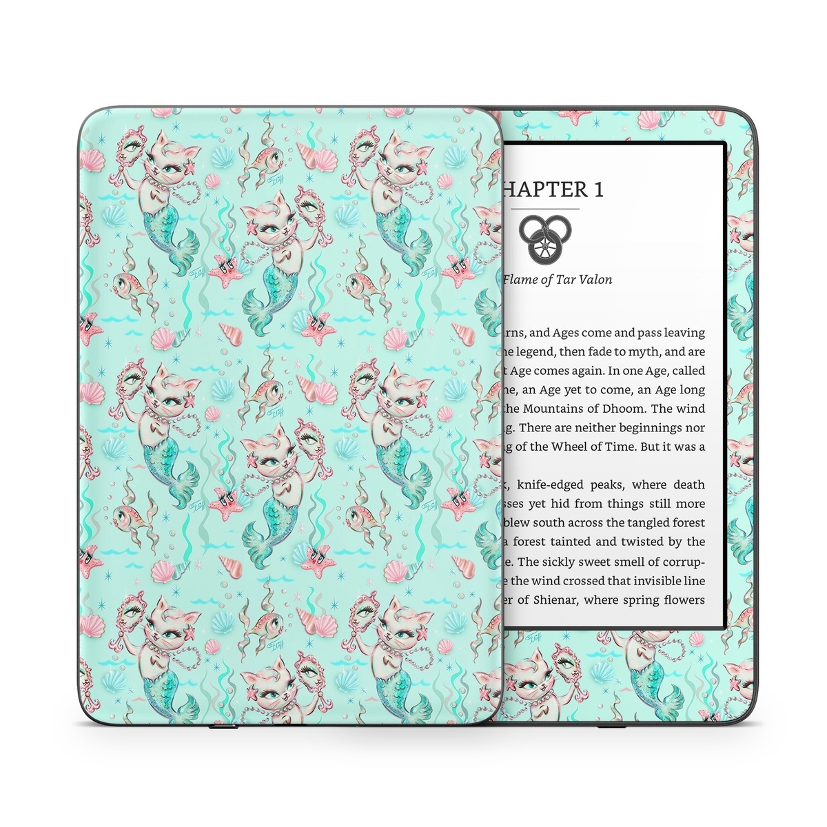 iStyles Amazon Kindle Series Skin design of Green, Aqua, Pattern, Teal, Turquoise, Pink, Textile, Wrapping paper, Design, with blue, pink, white, green colors, and tagged with patterns, animals, fantasy, objects, animals, cat, kitten, kittens, mermaid, mermaids, ocean, pastel, pattern, sea, sealife.