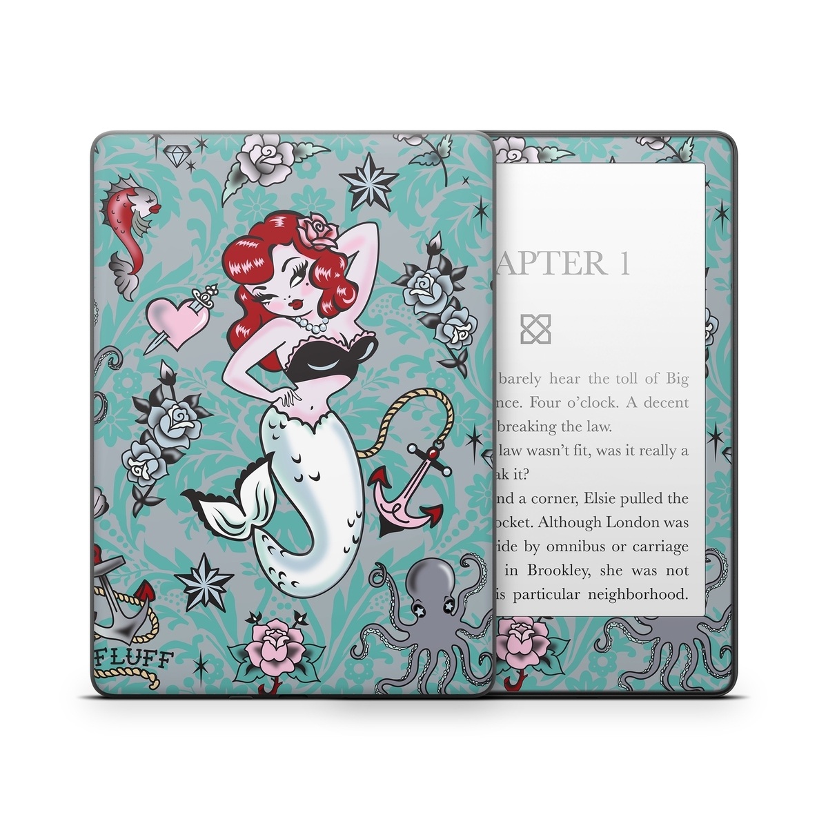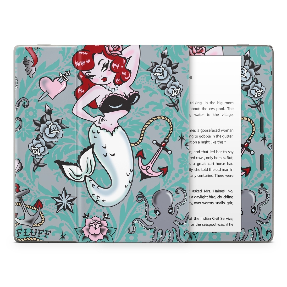 iStyles Amazon Kindle Series Skin design of Mermaid, Illustration, Fictional character, Organism, Art, Pattern, Style, with gray, blue, black, red, white, pink colors, and tagged with patterns, objects, hearts, people, animals.