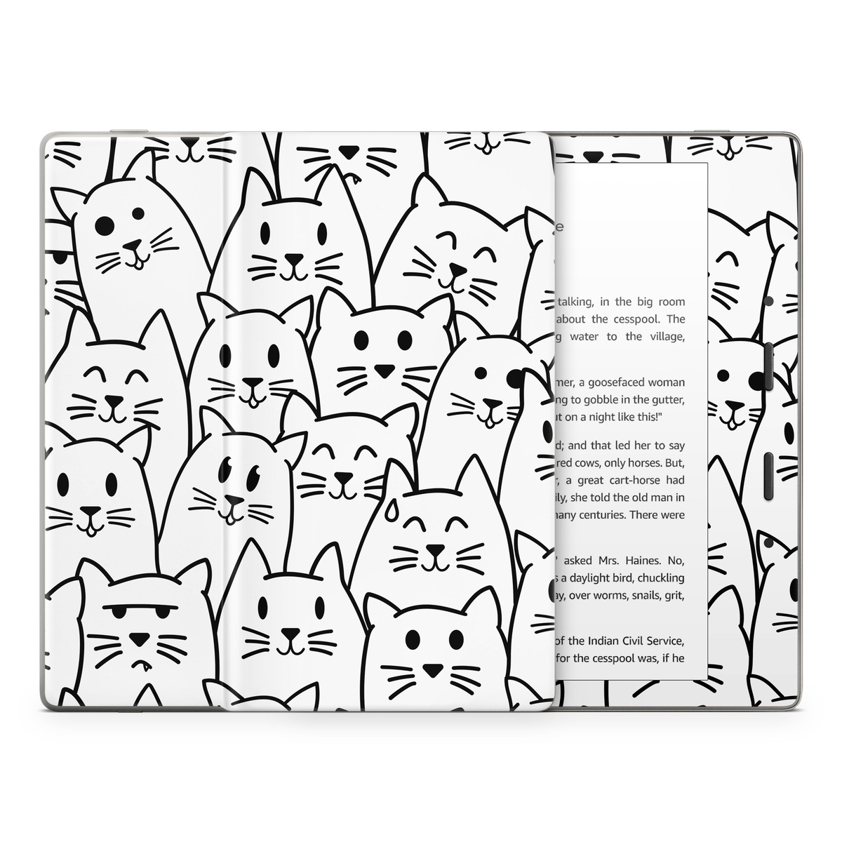 iStyles Amazon Kindle Series Skin design of White, Line art, Text, Black, Pattern, Black-and-white, Line, Design, Font, Organism, with white, black colors, and tagged with patterns, animals, animals, cartoon, cats, cute, kitty, lineart, sketch.