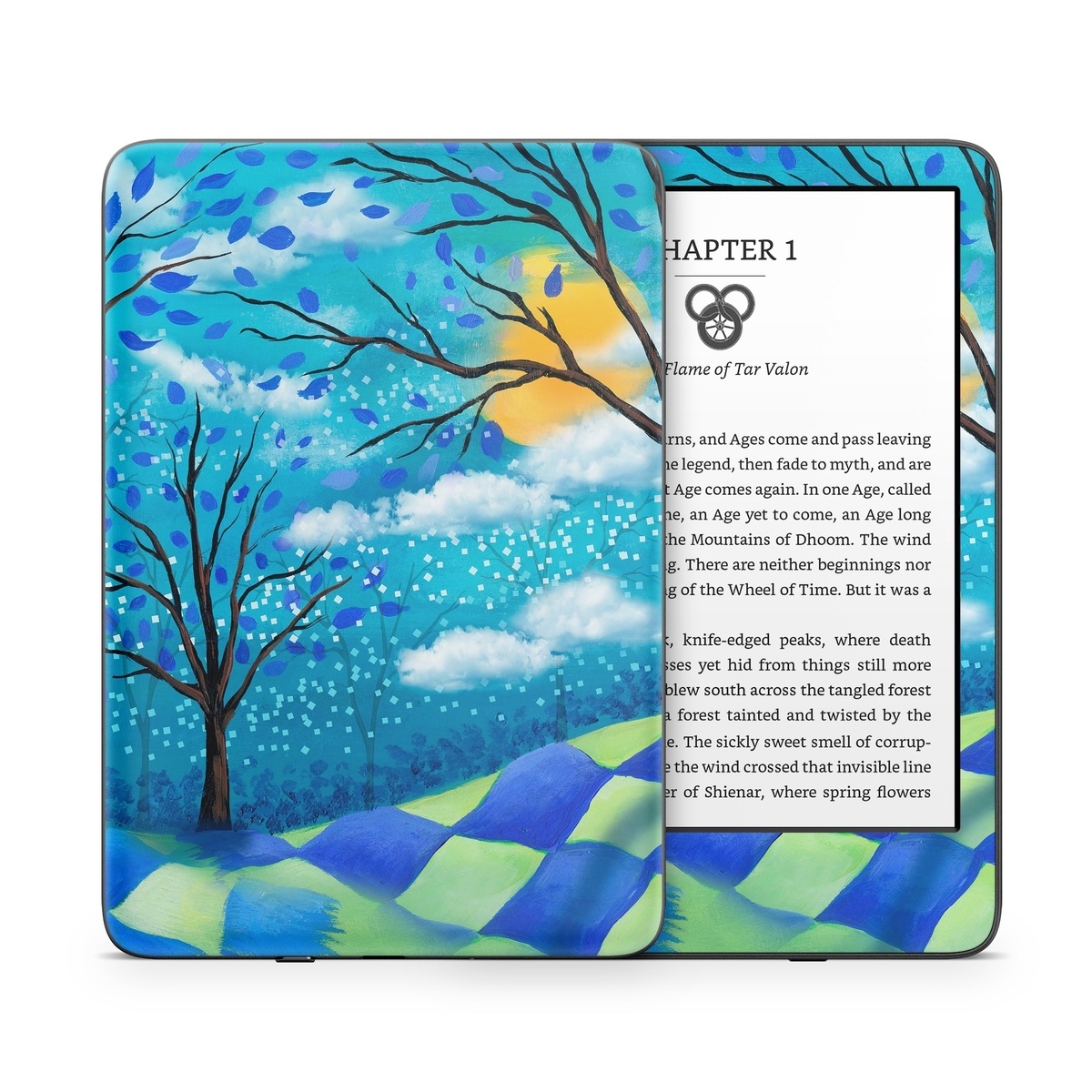 iStyles Amazon Kindle Series Skin design of Natural landscape, Nature, Blue, Tree, Sky, Branch, Spring, Woody plant, Plant, Leaf, with blue, gray, black, purple, green colors, and tagged with nature, fineart.