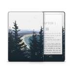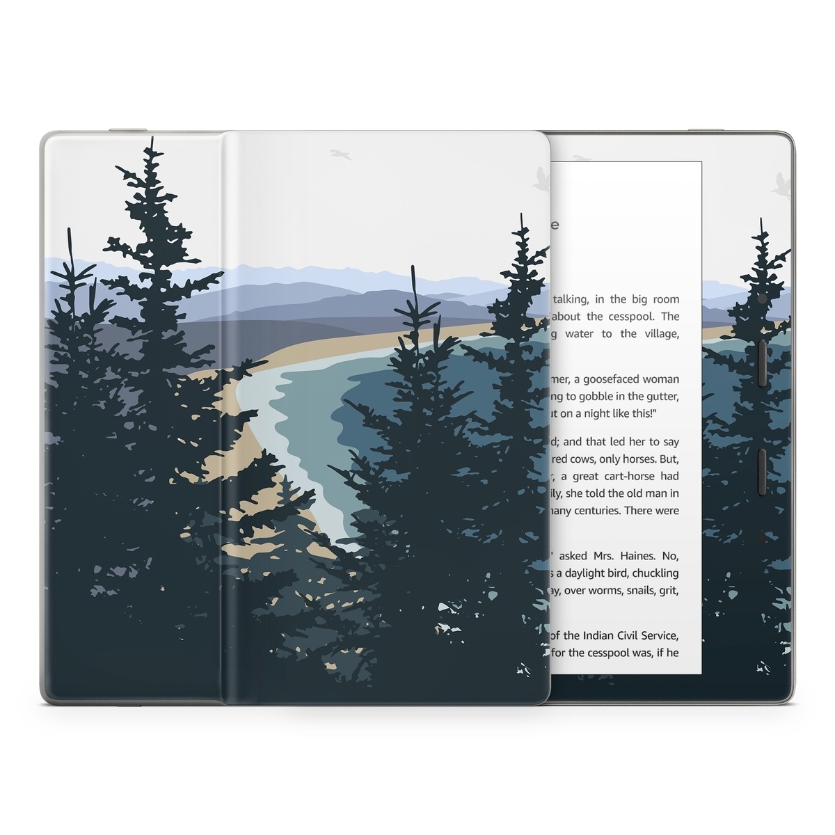 iStyles Amazon Kindle Series Skin design of Sky, Plant, Mountain, Natural landscape, Branch, Larch, Tree, Highland, Atmospheric phenomenon, Evergreen, with white, blue, yellow, gray, black, green colors, and tagged with nature, animals, ocean, beach, landscape, forest, trees, seagulls.