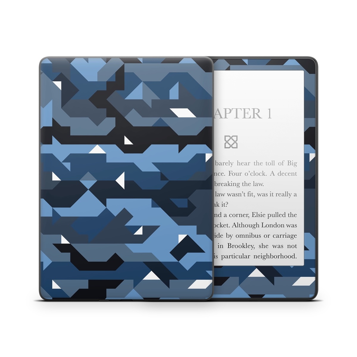 iStyles Amazon Kindle Series Skin design of Blue, Pattern, Design, Font, Line, Camouflage, Illustration, Triangle, with blue, black, white, gray colors, and tagged with patterns, military, blue, camo, digitalcamo, geometric.