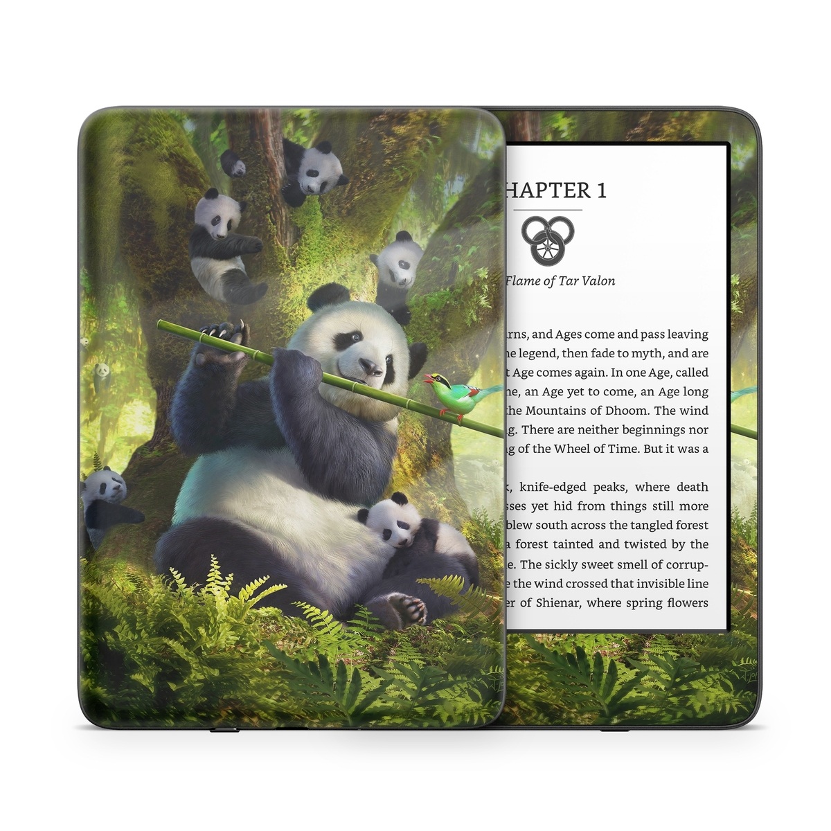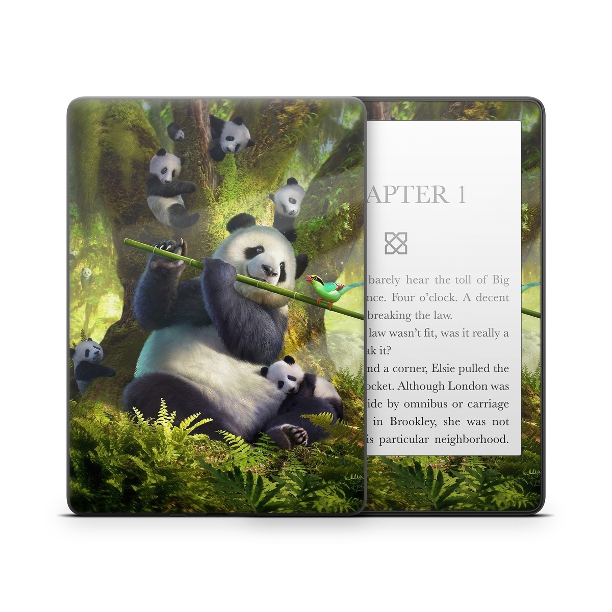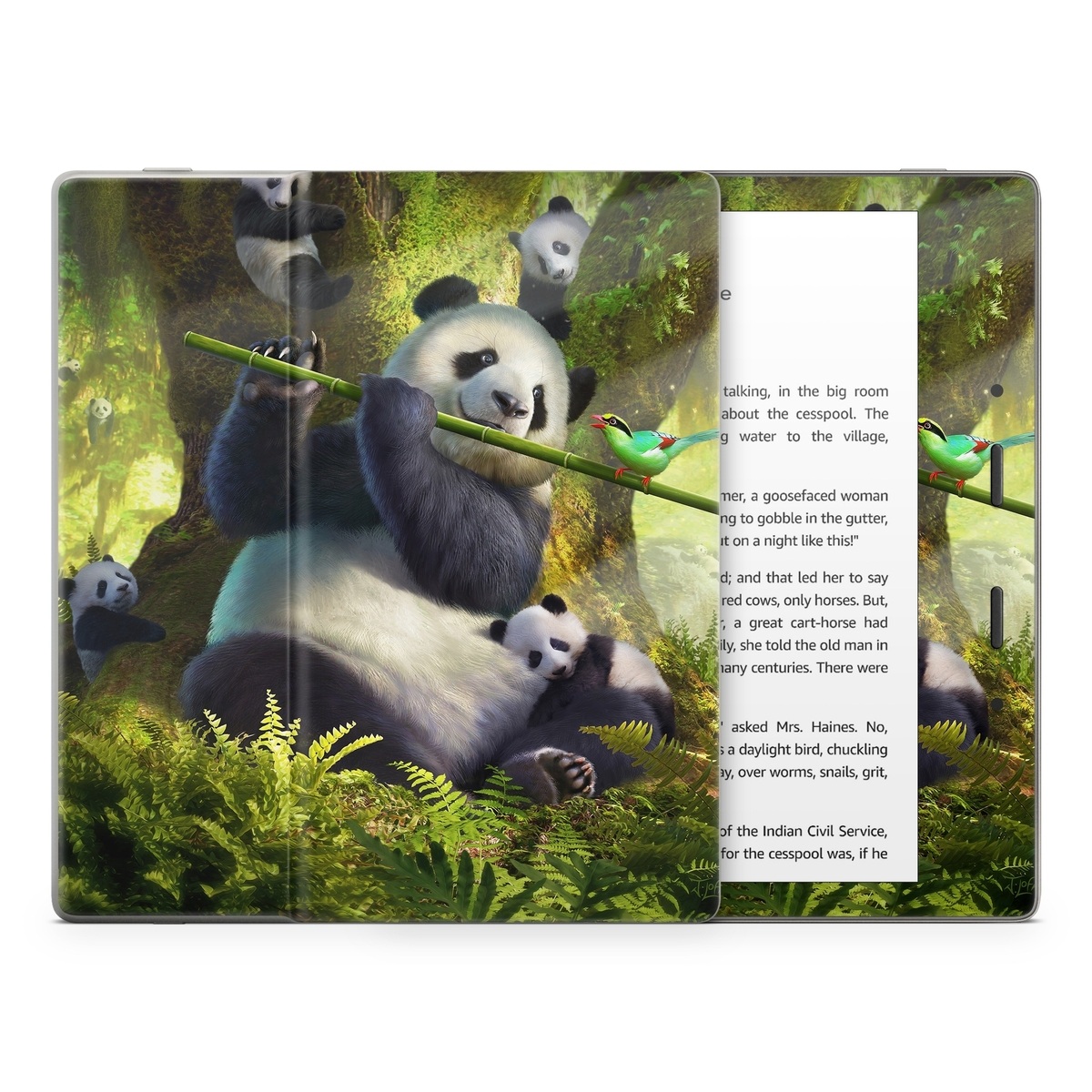 iStyles Amazon Kindle Series Skin design of Plant, Organism, Grass, Adaptation, Terrestrial animal, Painting, People in nature, Art, Beak, Panda, with white, black, brown, green, gray, yellow colors, and tagged with animals, nature, objects, animal, animals, bird, jungle, music, panda, pandabear, pandas.