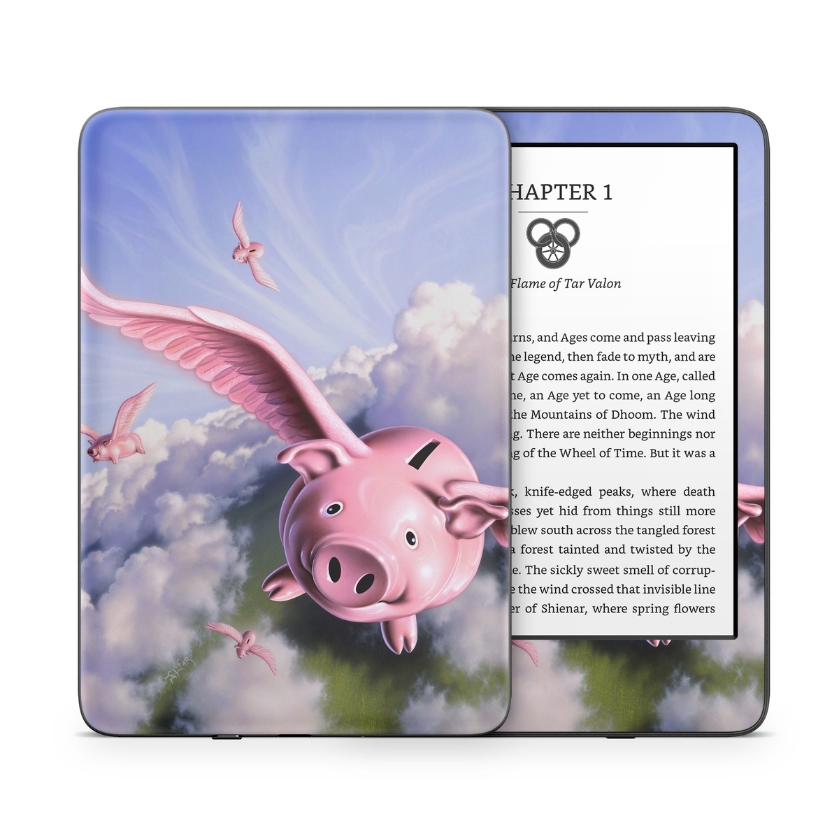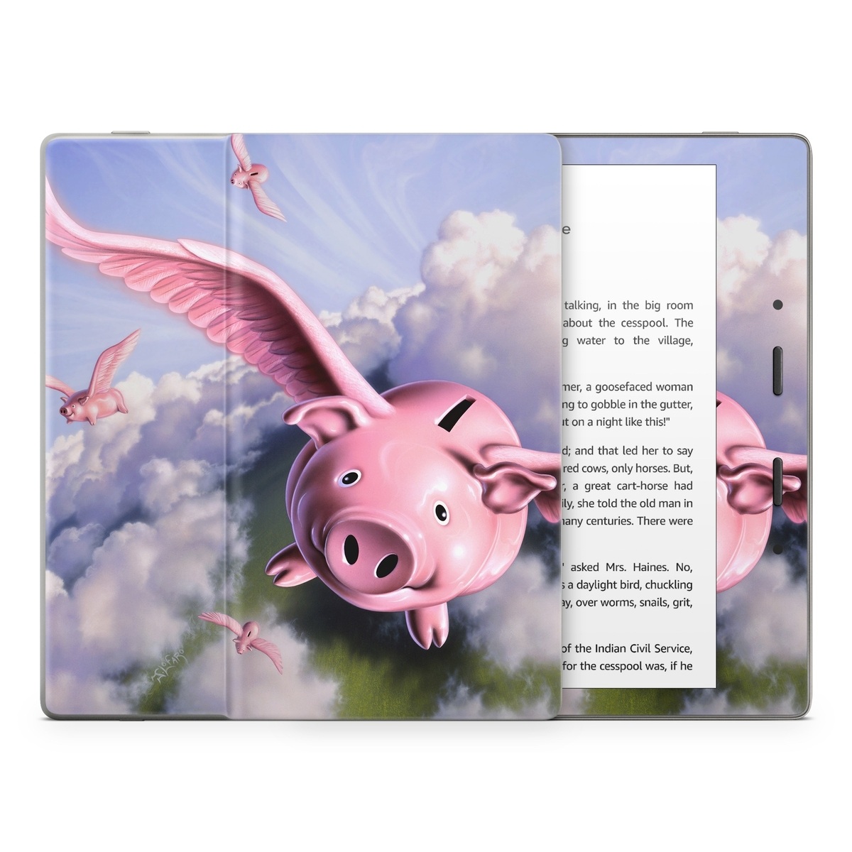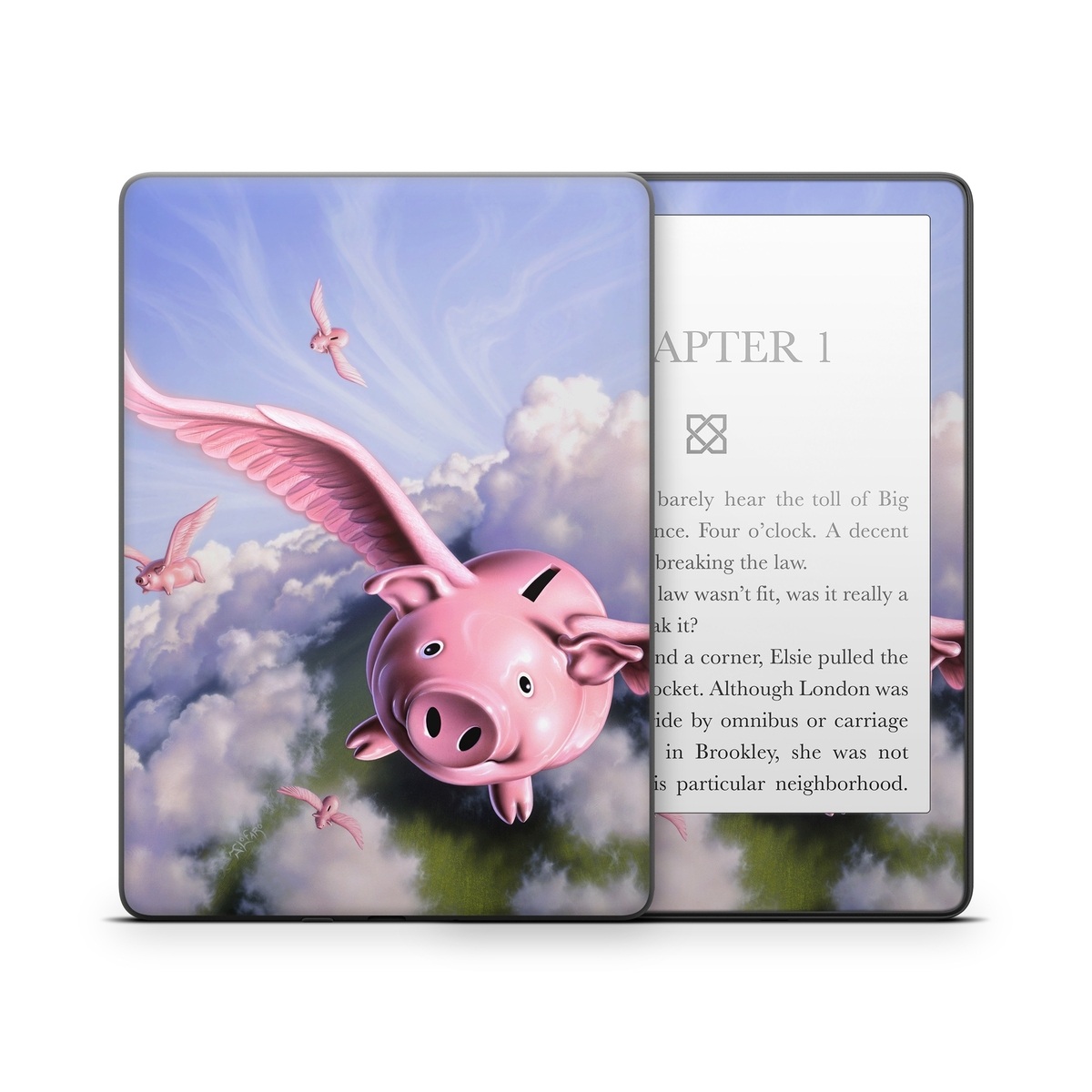 iStyles Amazon Kindle Series Skin design of Cloud, Sky, Happy, Pink, Bird, Art, Wing, Snout, Wind, Fictional character, with pink, white, blue, gray, green colors, and tagged with animals, nature, objects, animal, animals, farm, farming, pig, piggies, piggy.