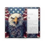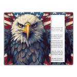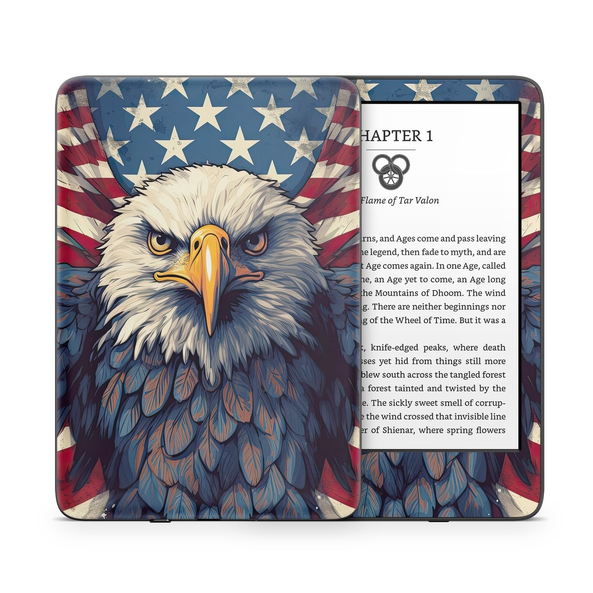 iStyles Amazon Kindle Series Skin design of Bird, Accipitridae, Beak, Sea eagle, Falconiformes, Feather, Eagle, Painting, Art, Bald eagle, with red, blue, white, brown, yellow, gray, orange colors, and tagged with flags, animals, signs, united, states, eagle, flag, stars, stripes.
