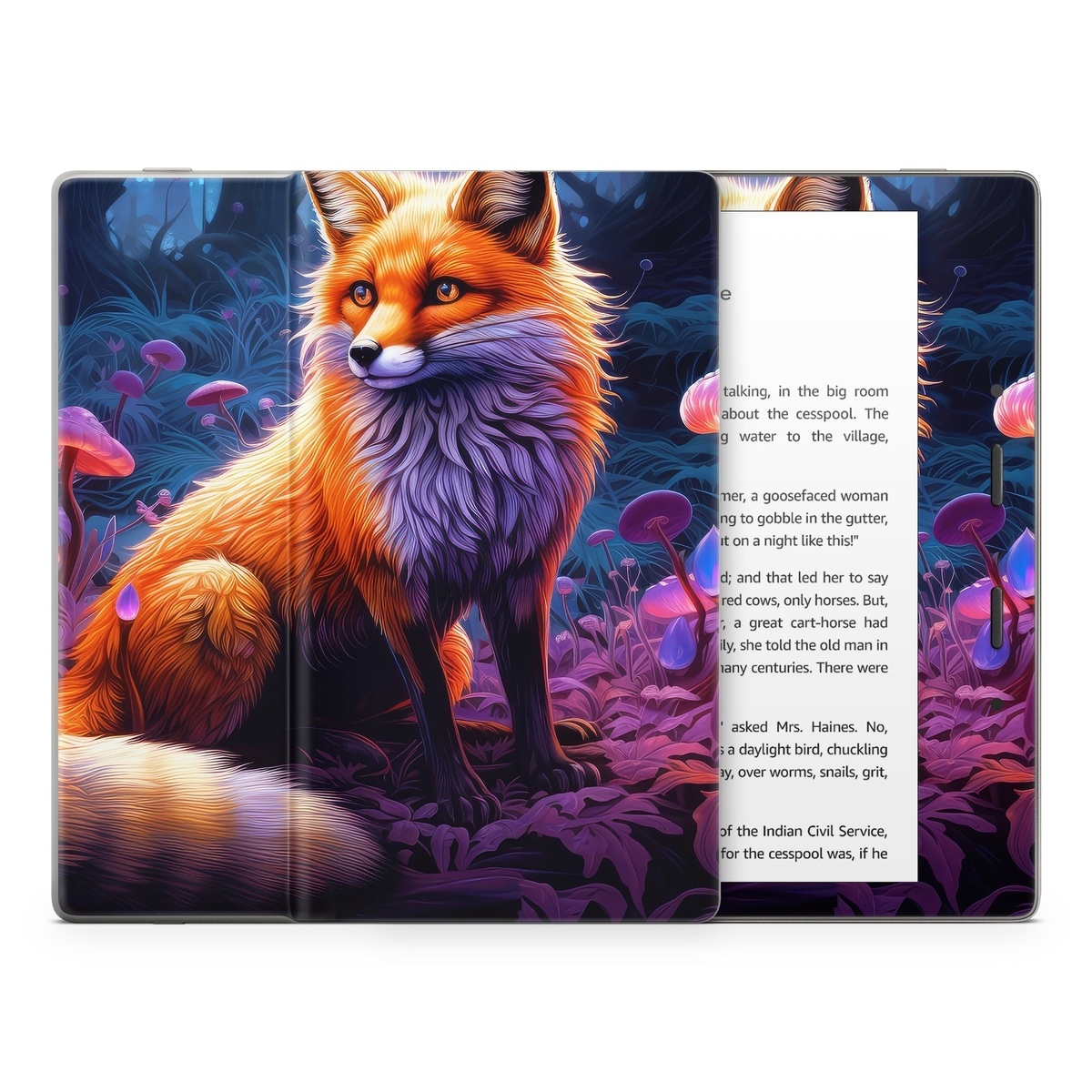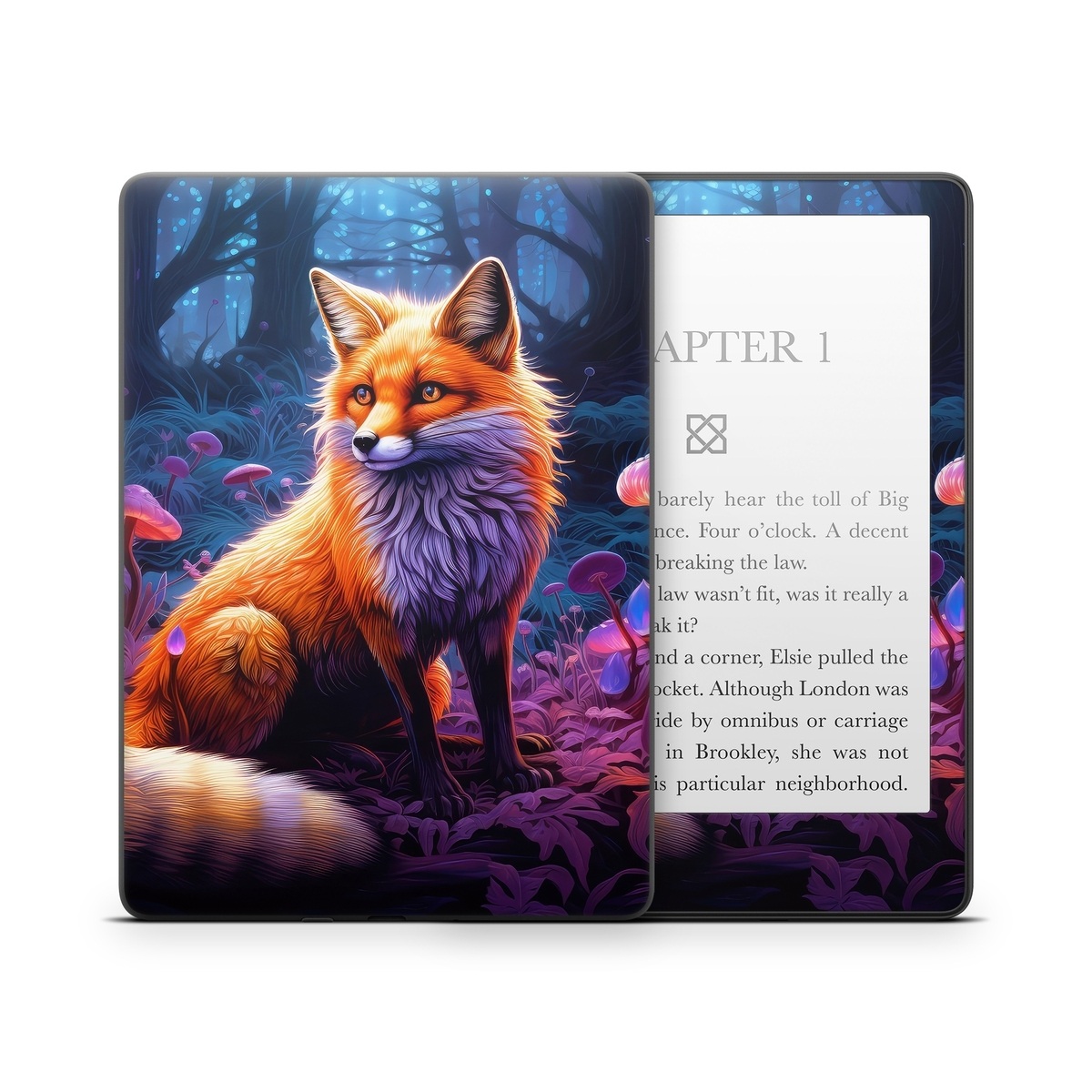 iStyles Amazon Kindle Series Skin design of Plant, Light, Carnivore, Orange, Organism, Tree, Pink, Natural landscape, Fawn, Whiskers, with red, orange, white, black, purple, gray, green colors, and tagged with animals, nature, fineart, fox, forest, mushrooms, trees, dusk, glow, bushy, tail.