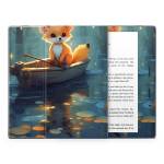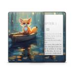 iStyles Amazon Kindle Series Skin design of Water, Boat, Light, Nature, Organism, Orange, Cartoon, Watercraft, Art, Plant, with blue, yellow, orange, white, black, gray, green, brown colors, and tagged with fineart, animals, objects, fantasy, nature, fox, boat, character, water, lilies, paddle.