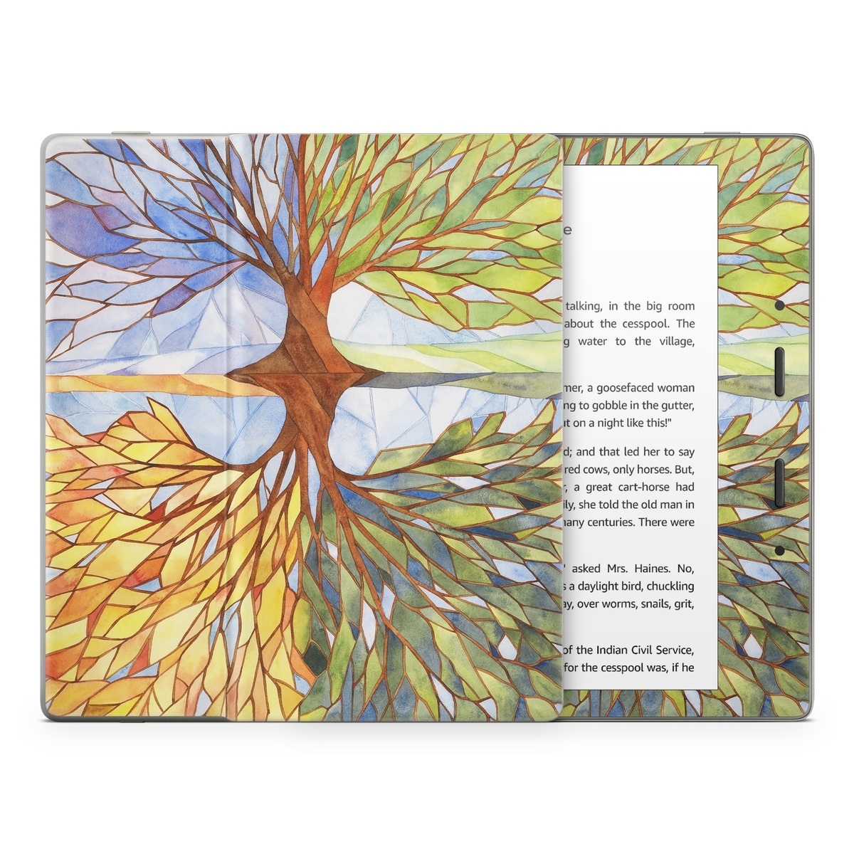 iStyles Amazon Kindle Series Skin design of Leaf, Tree, Botany, Plant, Symmetry, Art, Pattern, Painting, Plant stem, Plane, with blue, brown, orange, yellow, red, purple colors, and tagged with nature, patterns, leaves, nature, plant, seasons, tree, watercolor.