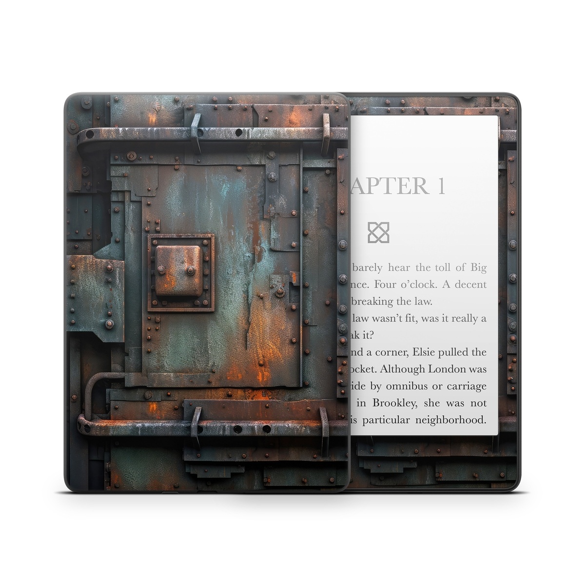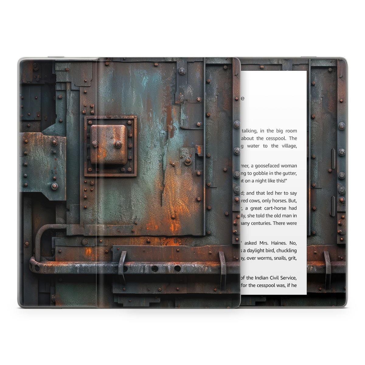 iStyles Amazon Kindle Series Skin design of Wood, Train, Wheel, Motor vehicle, Mode of transport, Rolling, Automotive lighting, Rolling stock, freight car, Gas, with black, brown, gray, white, orange colors, and tagged with lookslike, objects, safe, vault, bank, steel, rust.