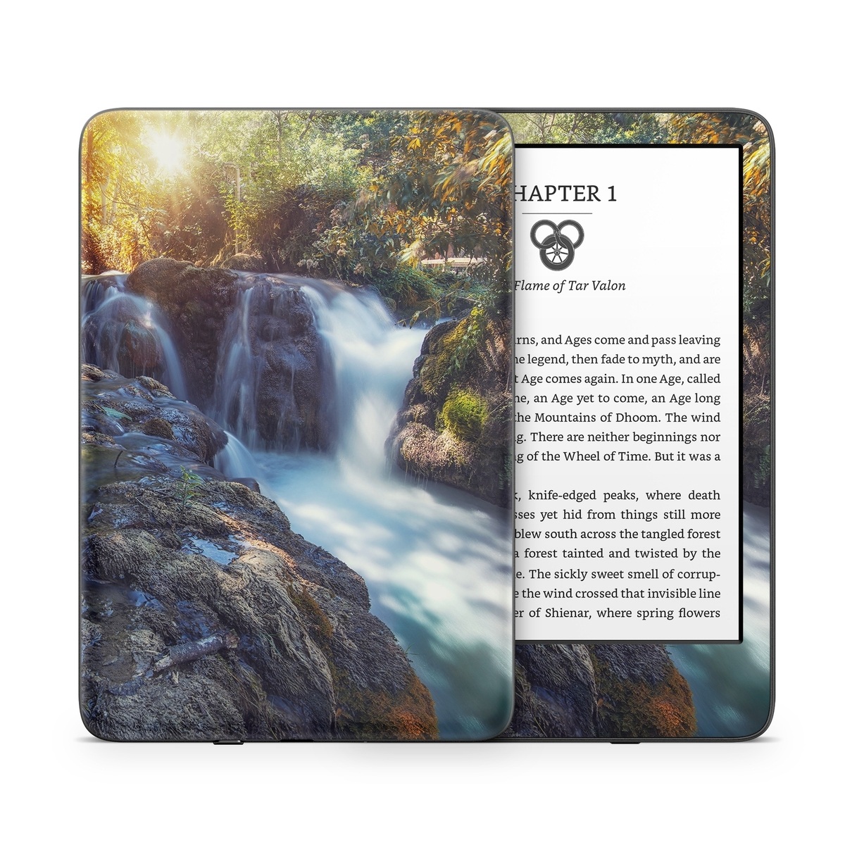 iStyles Amazon Kindle Series Skin design of Waterfall, Natural landscape, Body of water, Nature, Water resources, Water, Watercourse, Stream, Nature reserve, Rock, with gray, yellow, orange, green, white, blue colors, and tagged with nature, photos, hiking, landscapes, outdoors, photography, waterfall.
