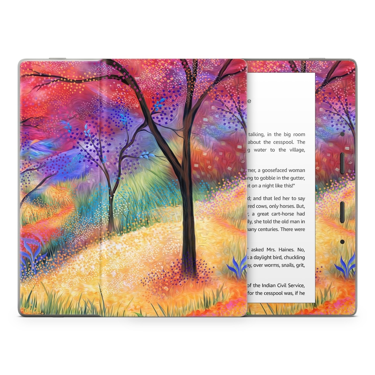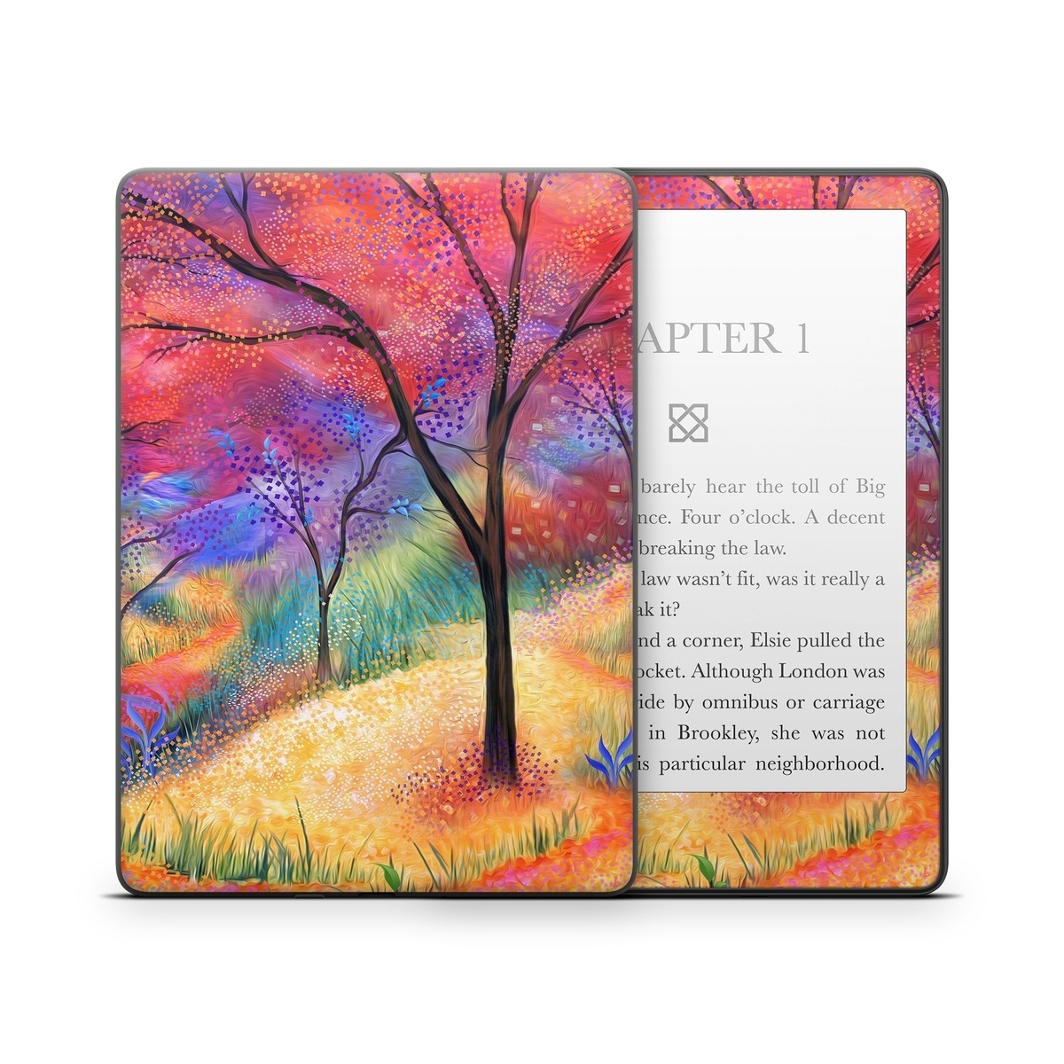 iStyles Amazon Kindle Series Skin design of Plant, Art paint, Paint, Botany, Natural environment, Natural landscape, Leaf, Branch, People in nature, Tree, with red, blue, yellow, green, purple, orange, black, white colors, and tagged with nature, fineart, blue, forest, meadow, pink, purple, sunset, tree, trees, yellow.