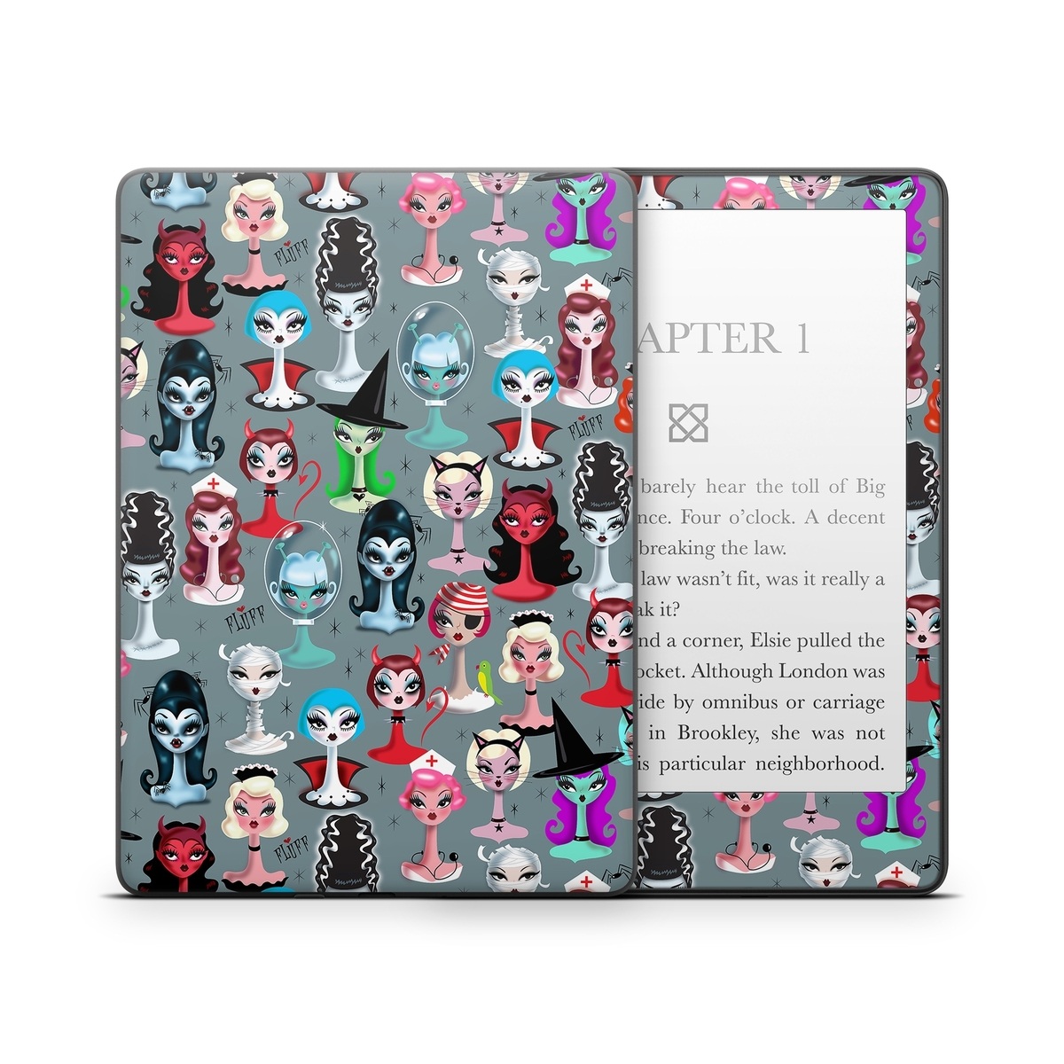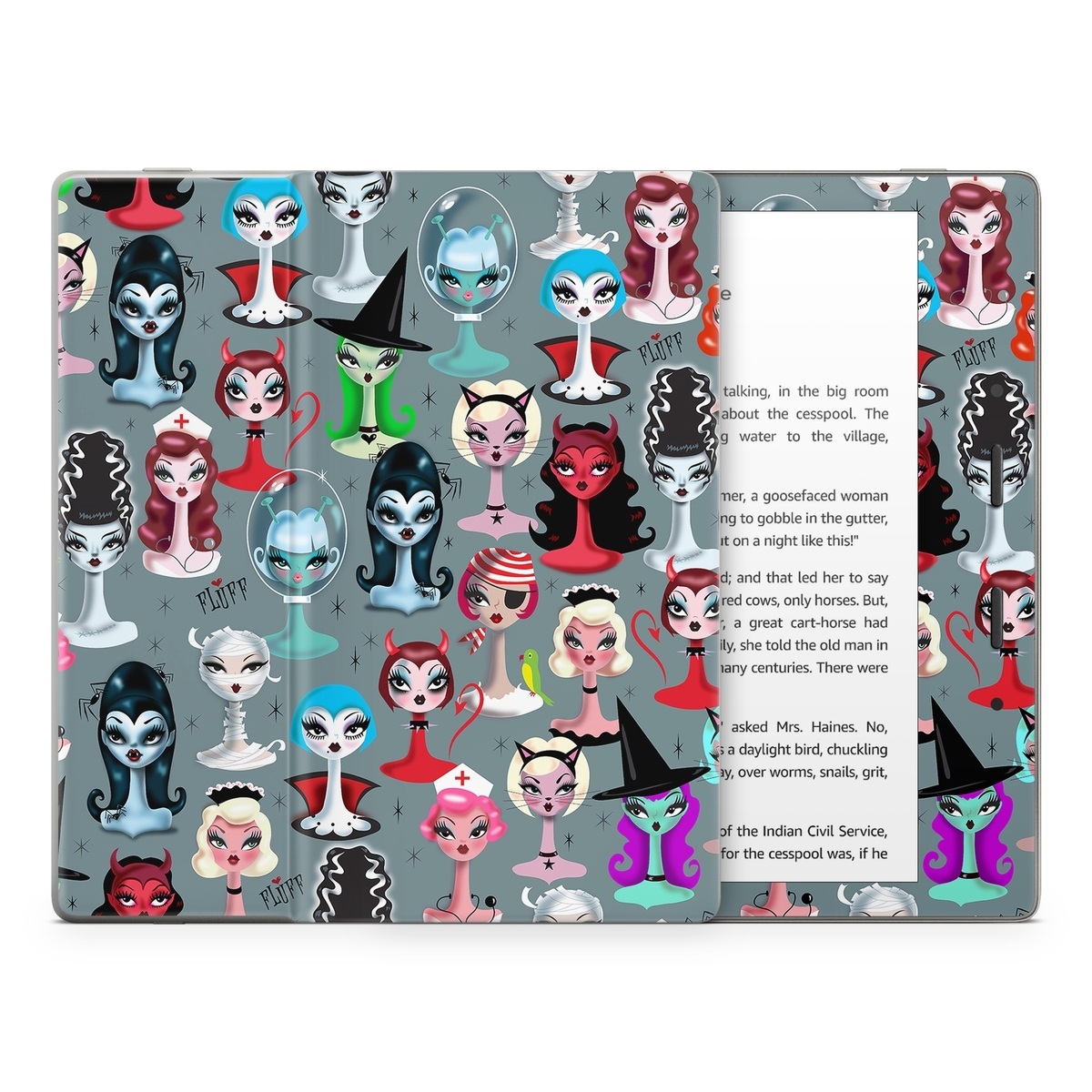 iStyles Amazon Kindle Series Skin design of Facial expression, Head, Design, Collection, Fictional character, Pattern, Skull, Illustration, Collage, Style, with gray, white, red, blue, green, black, pink, purple colors, and tagged with people, fantasy, objects, costume, halloween, horror, pinup, pinupgirl.