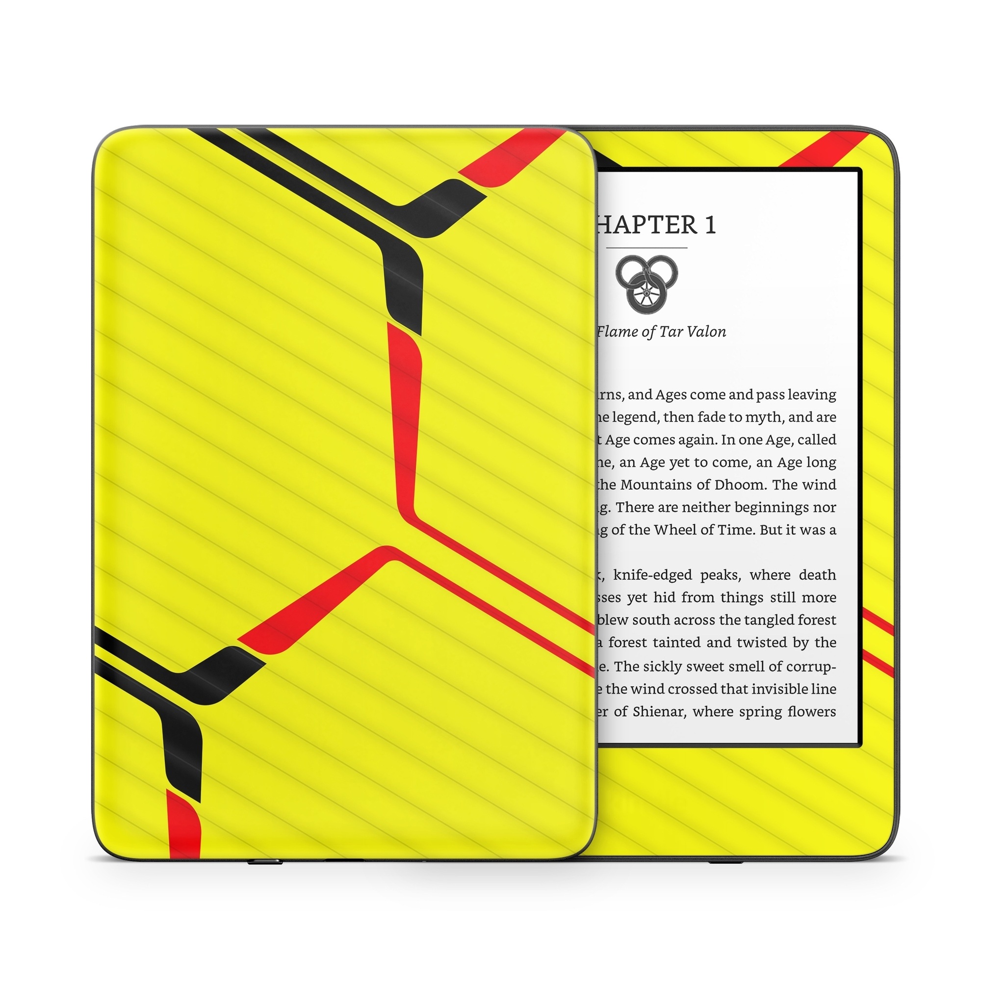 iStyles Amazon Kindle Series Skin design of Rectangle, Yellow, Parallel, Font, Tints and shades, Wood, Triangle, Pattern, Graphics, Symmetry, with yellow, black, red colors, and tagged with patterns, hexagon, pattern, lines.