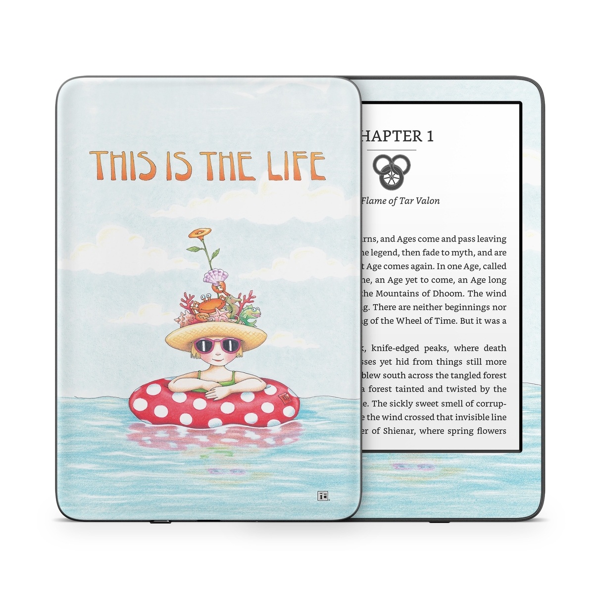 iStyles Amazon Kindle Series Skin design of Cartoon, Illustration, Clip art, with blue, red, white, yellow, green, orange, pink colors, and tagged with signs, flowers, people, objects, animals, beach, crab, funny, humor, ocean, sea, water, waves.