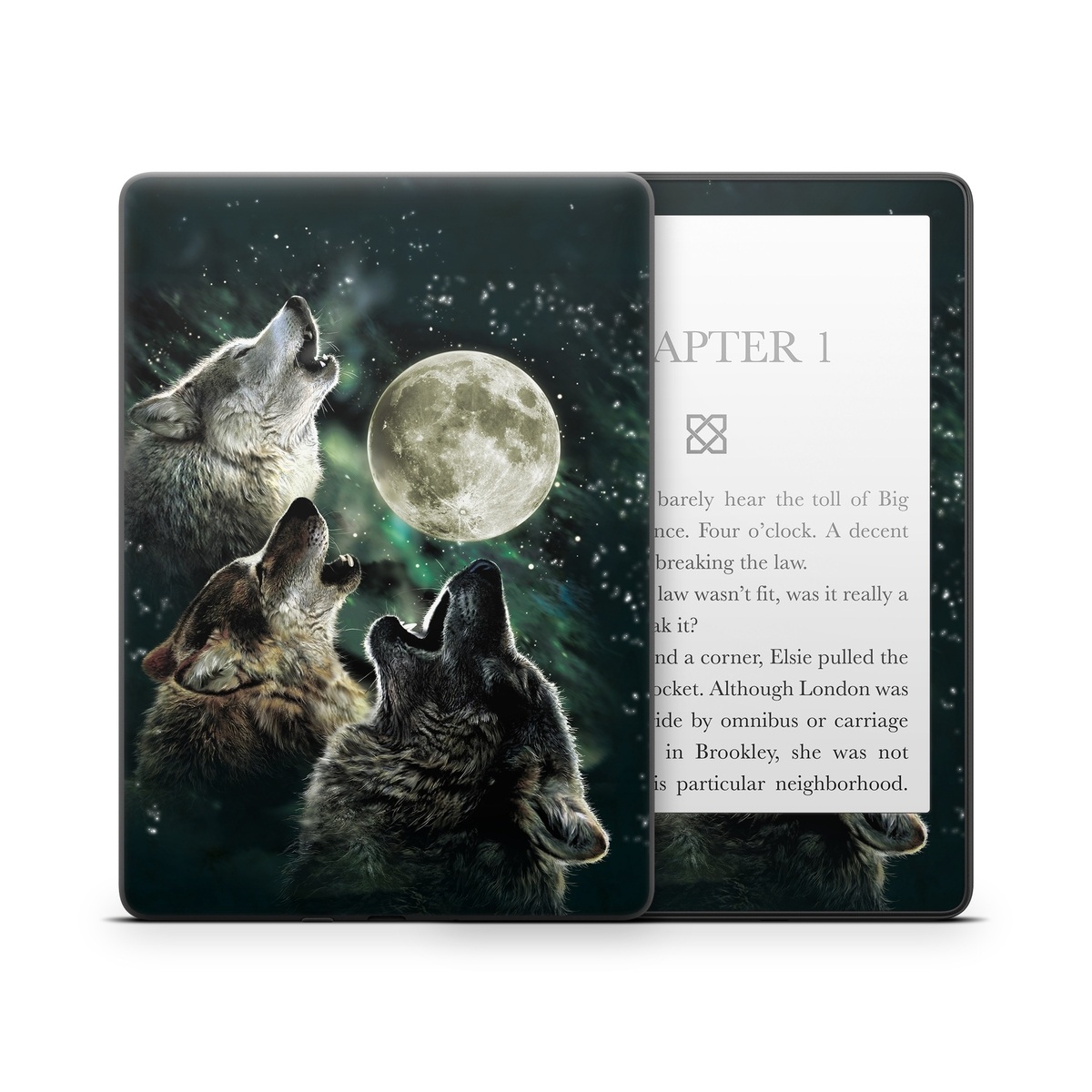 iStyles Amazon Kindle Series Skin design of Wolf, Light, Astronomical object, Moon, Wildlife, Organism, Moonlight, Sky, Atmosphere, Celestial event, with black, gray, green colors, and tagged with animals.