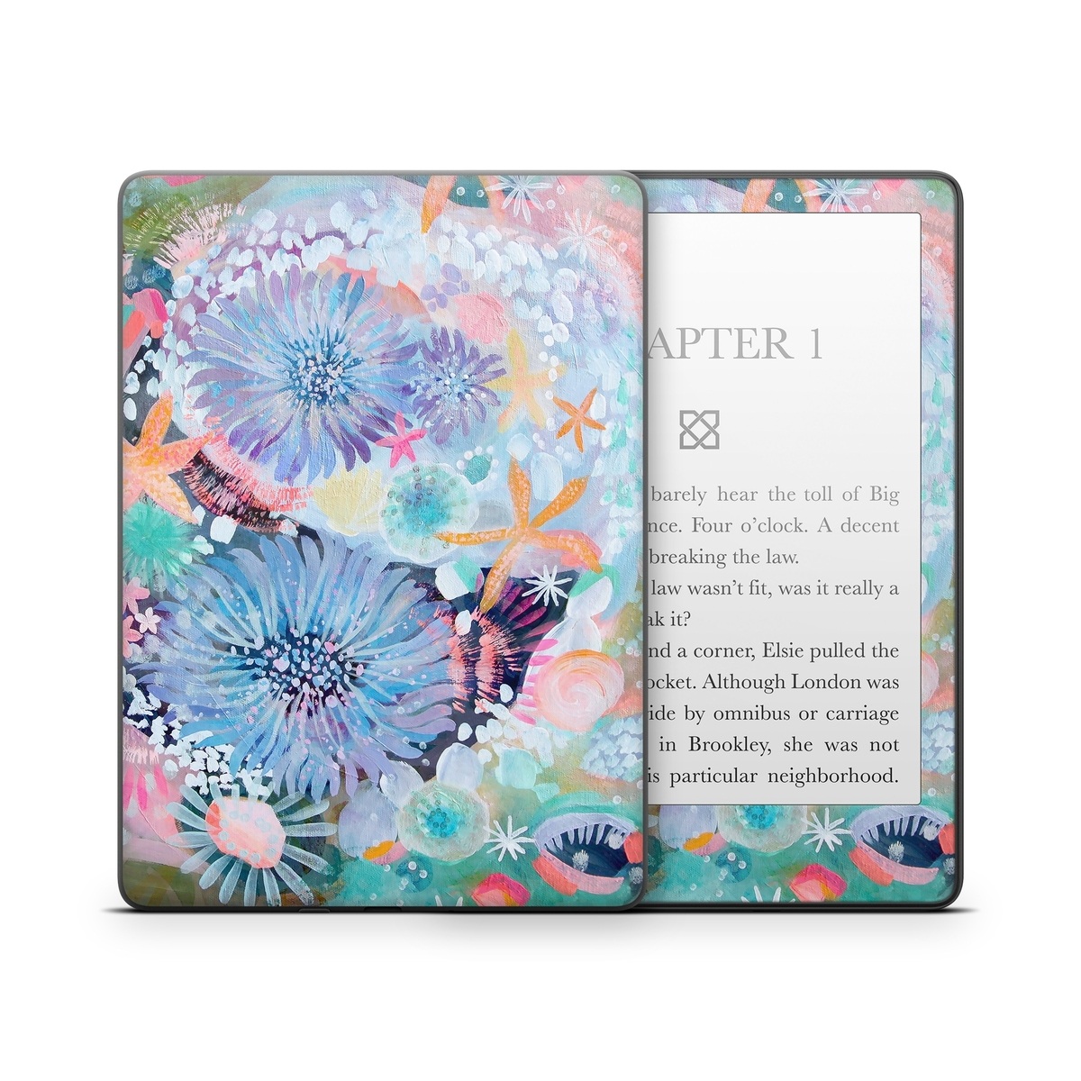 iStyles Amazon Kindle Series Skin design of Pattern, Aqua, Textile, Design, Watercolor paint, Visual arts, Flower, Art, Plant, Illustration, with blue, orange, pink, purple, green, white colors, and tagged with nature, flowers, animals, beach, bright, flowers, ocean, pastel, sea, sealife, starfish, water, watercolor.