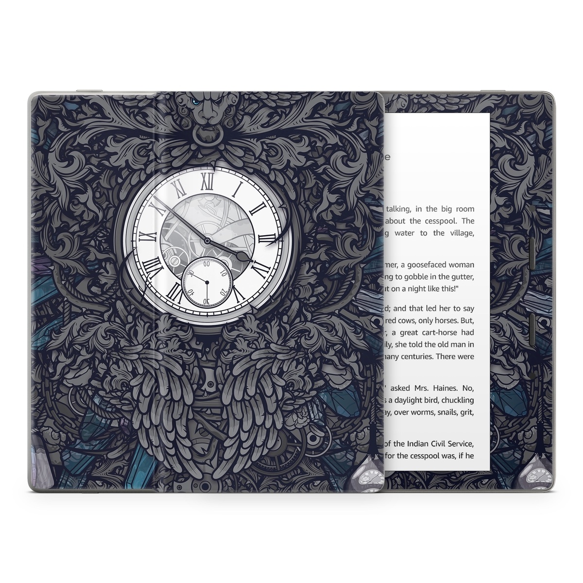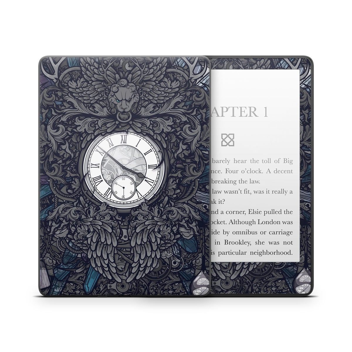 iStyles Amazon Kindle Series Skin design of Blue, Pattern, Psychedelic art, Design, Circle, Art, Font, Graphic design, Visual arts, Illustration, with black, gray colors, and tagged with objects, patterns, animals, grandfather, clock, clocks, alarm, time, antique, table.