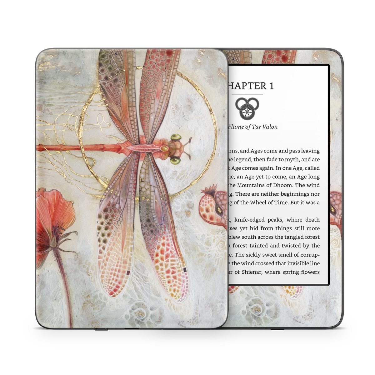 iStyles Amazon Kindle Series Skin design of Watercolor paint, Botany, Flower, Illustration, Floral design, Painting, Plant, Coquelicot, Art, Still life photography, with red, yellow, gray colors, and tagged with animals, flowers, bugs, dragonfly, flowers, insects.