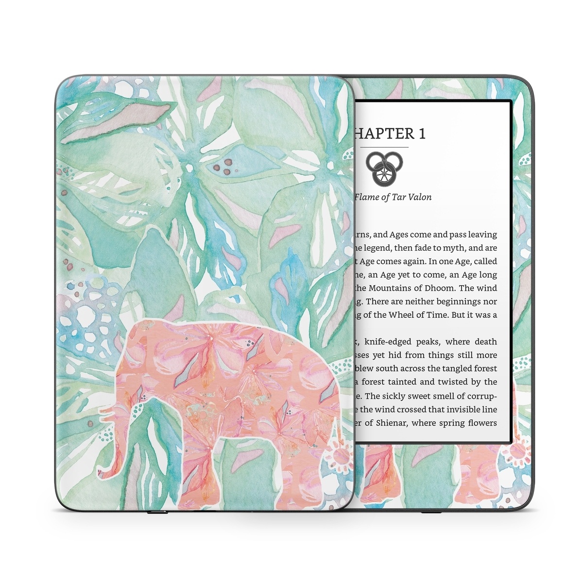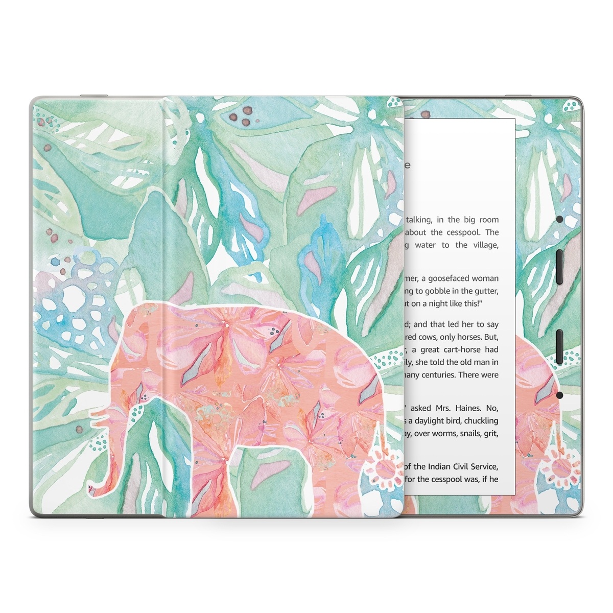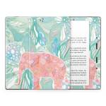 iStyles Amazon Kindle Series Skin design of Aqua, Turquoise, Pattern, Wrapping paper, Design, Illustration, Plant, Gift wrapping, Art, with blue, pink, white, green colors, and tagged with abstract, animals, flowers, animals, blue, bright, elephant, floral, flowers, pink, plants, tropical, watercolor.
