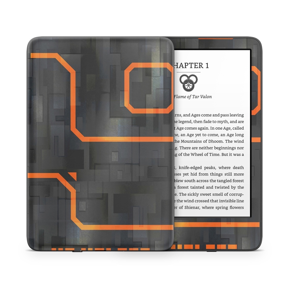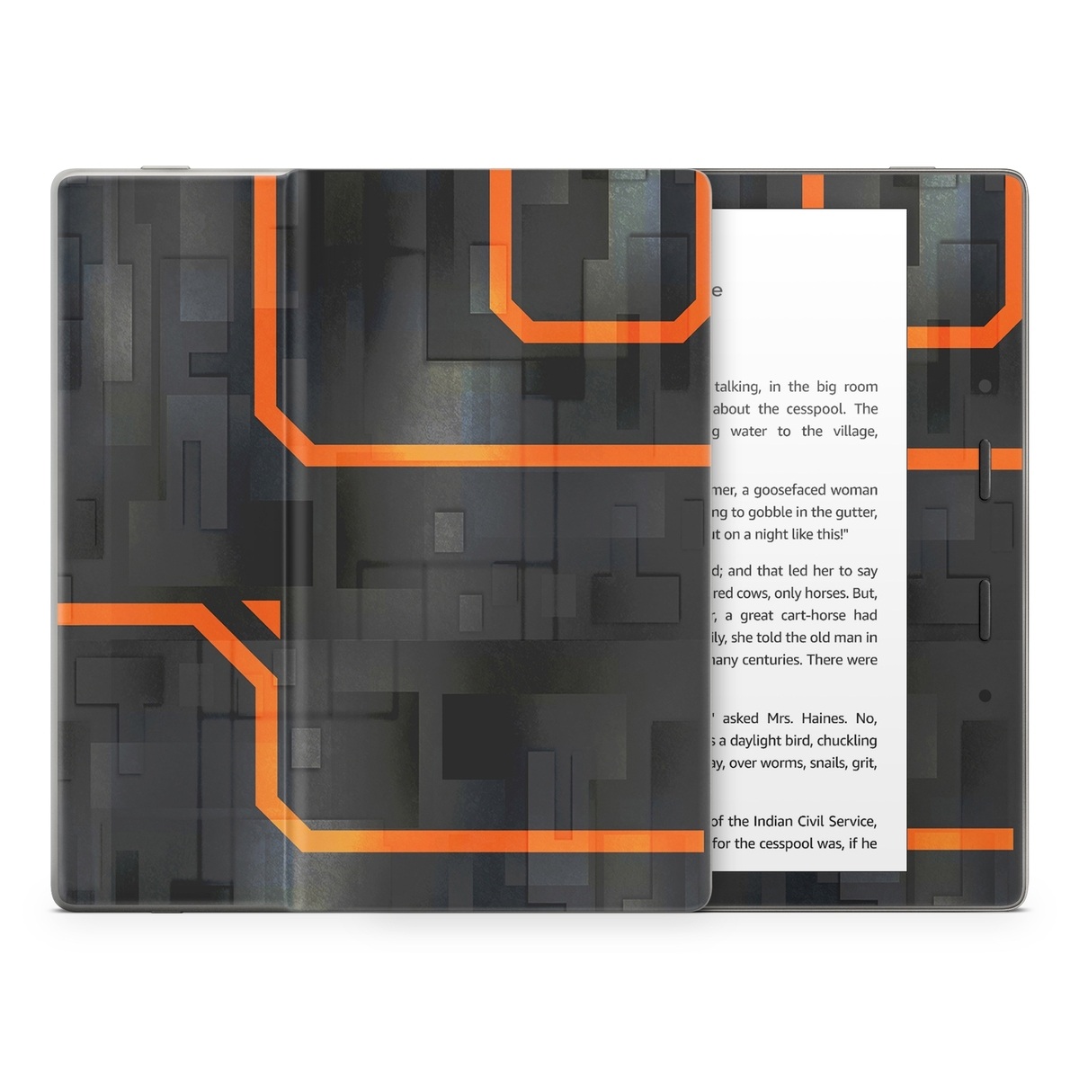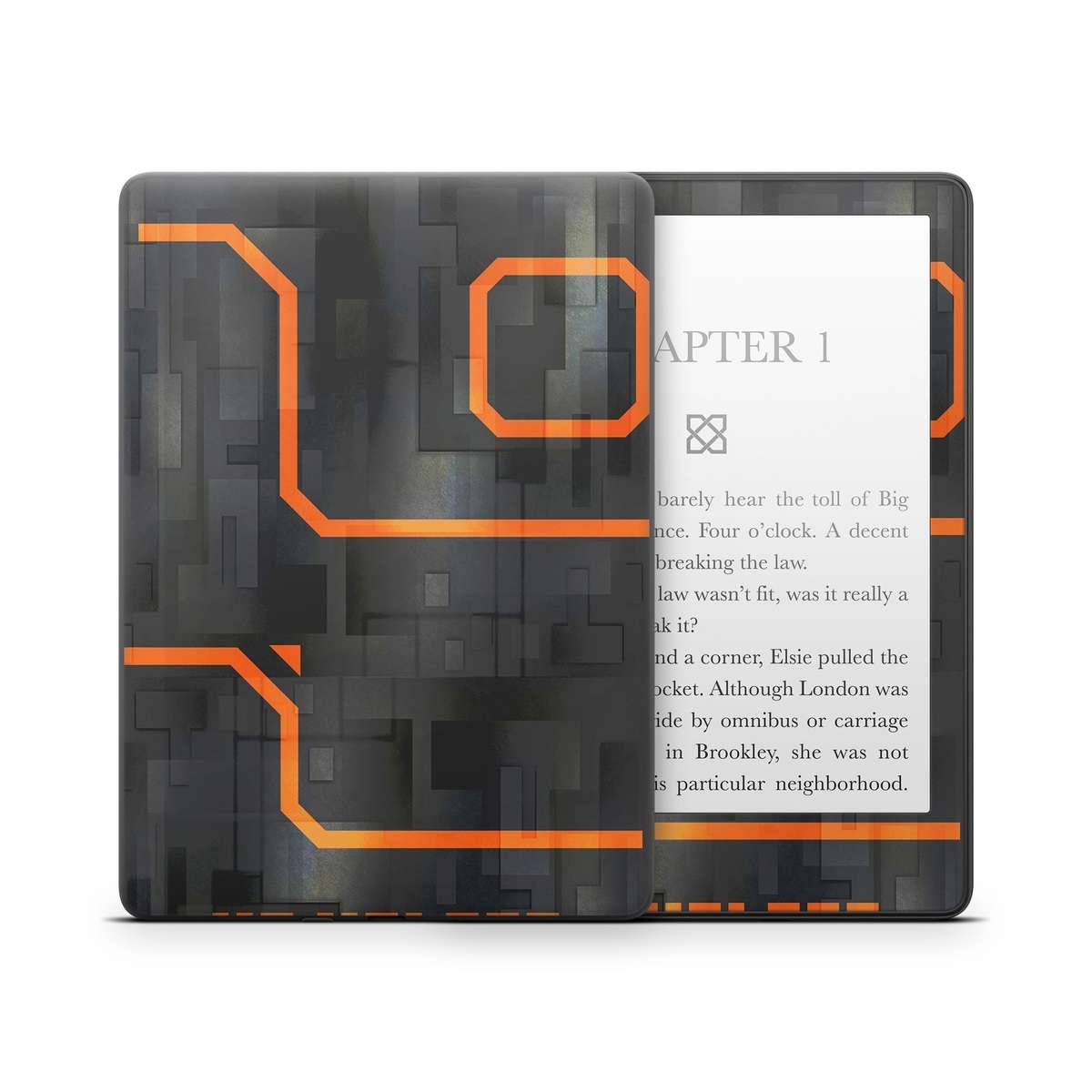 iStyles Amazon Kindle Series Skin design of Orange, Font, Parallel, Pattern, Graphics, Rectangle, Logo, Brand, Graphic design, Event, with black, orange colors, and tagged with patterns, lookslike, space, spaceship, fighterjet.