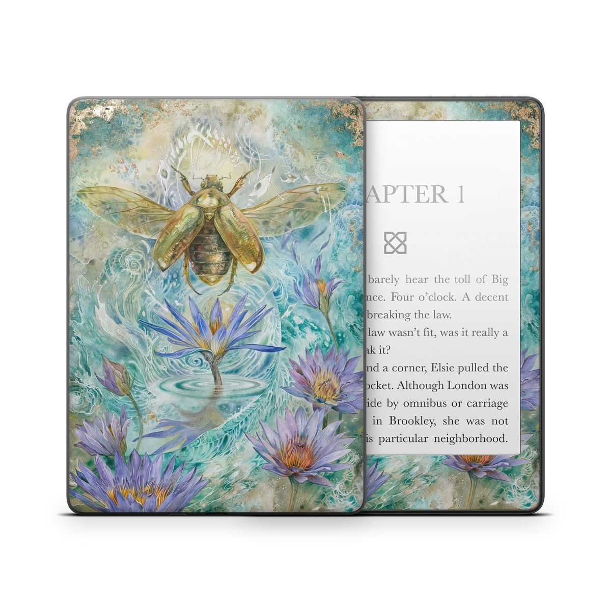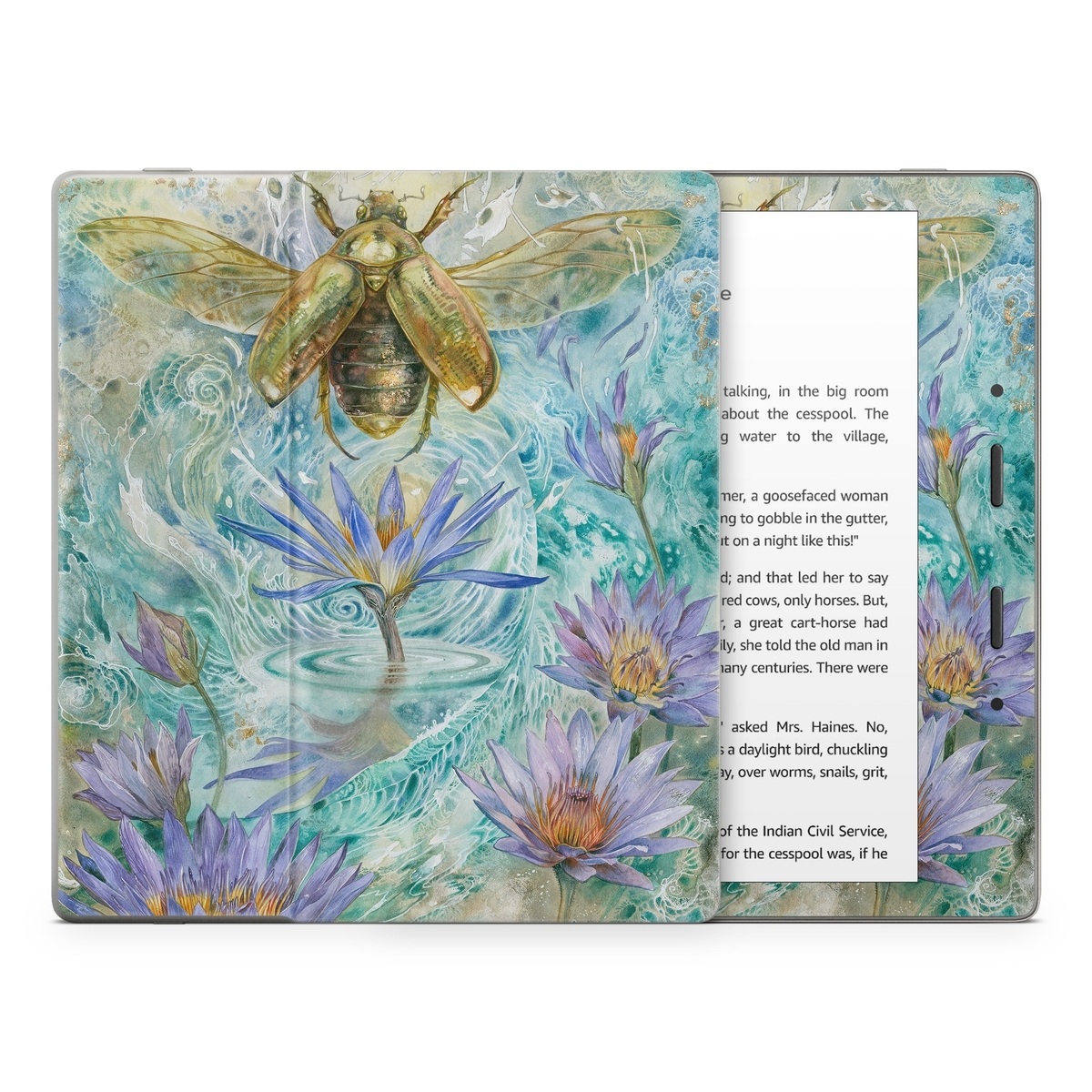 iStyles Amazon Kindle Series Skin design of Painting, Fictional character, Art, Flower, Watercolor paint, Plant, Wildflower, Angel, Honeybee, Mythology, with blue, yellow, brown, purple, red, white colors, and tagged with animals, nature, flowers, bug, bugs, flowers, insects, water.