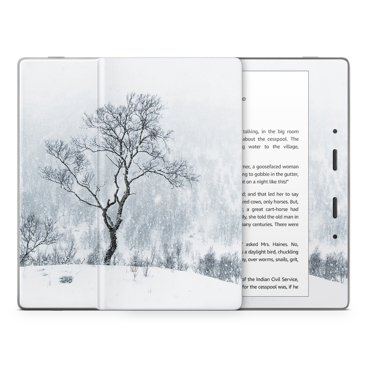 iStyles Amazon Kindle Series Skin design of Snow, Winter, Tree, Nature, White, Sky, Atmospheric phenomenon, Natural landscape, Freezing, Blizzard, with white, gray, black colors, and tagged with nature, photos, forest, landscape, mountains, outdoors, snow, trees, winter.