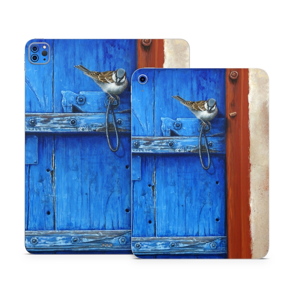 iStyles Apple iPad Series Skin design of Blue, Wood, Door handle, Door, Wall, Door knocker, Electric blue, Still life photography, Window, Handle, with red, blue, brown colors, and tagged with animals, fineart, animal, bird, birds, fineart, outdoors.