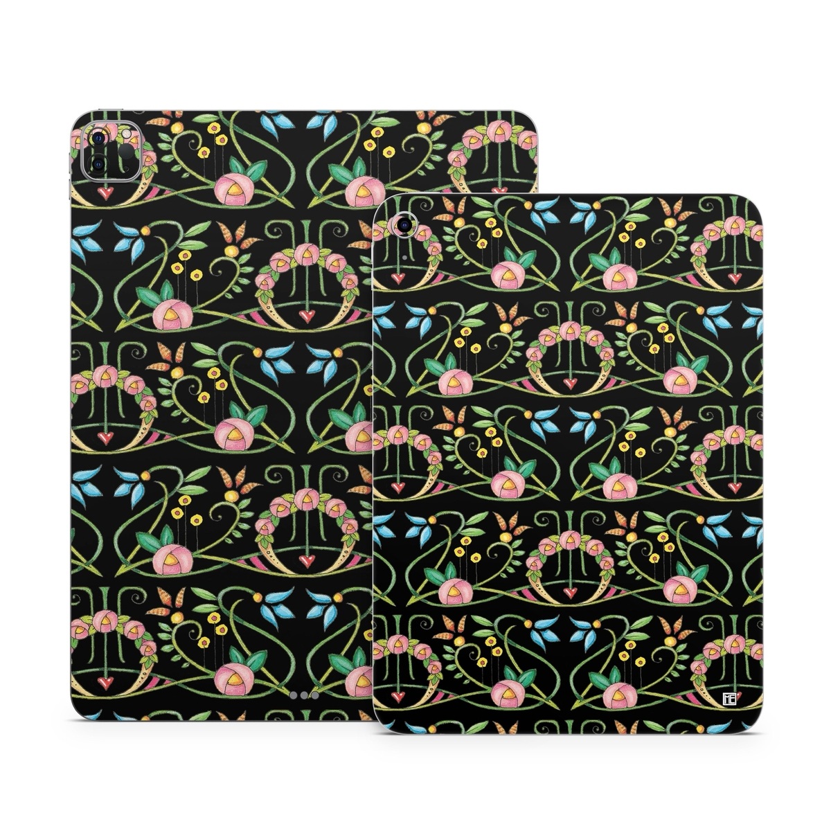 iStyles Apple iPad Series Skin design of Flower, Rectangle, Textile, Ornament, Plant, Line, Motif, Creative arts, Art, Pattern, with black, pink, blue, green, yellow colors, and tagged with patterns, flowers, flower, arc, pattern.