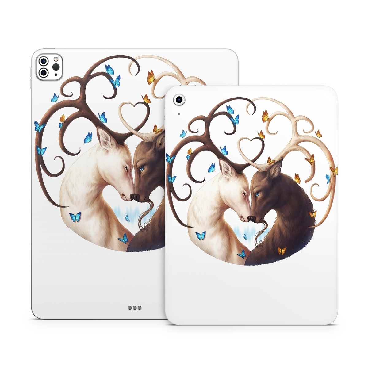 iStyles Apple iPad Series Skin design of Gesture, Fawn, Serveware, Horn, Font, Art, Mythical creature, Dishware, Tail, Drinkware, with white, brown, blue, yellow, orange colors, and tagged with animals, signs, antlers, butterflies, deer, yinyang.
