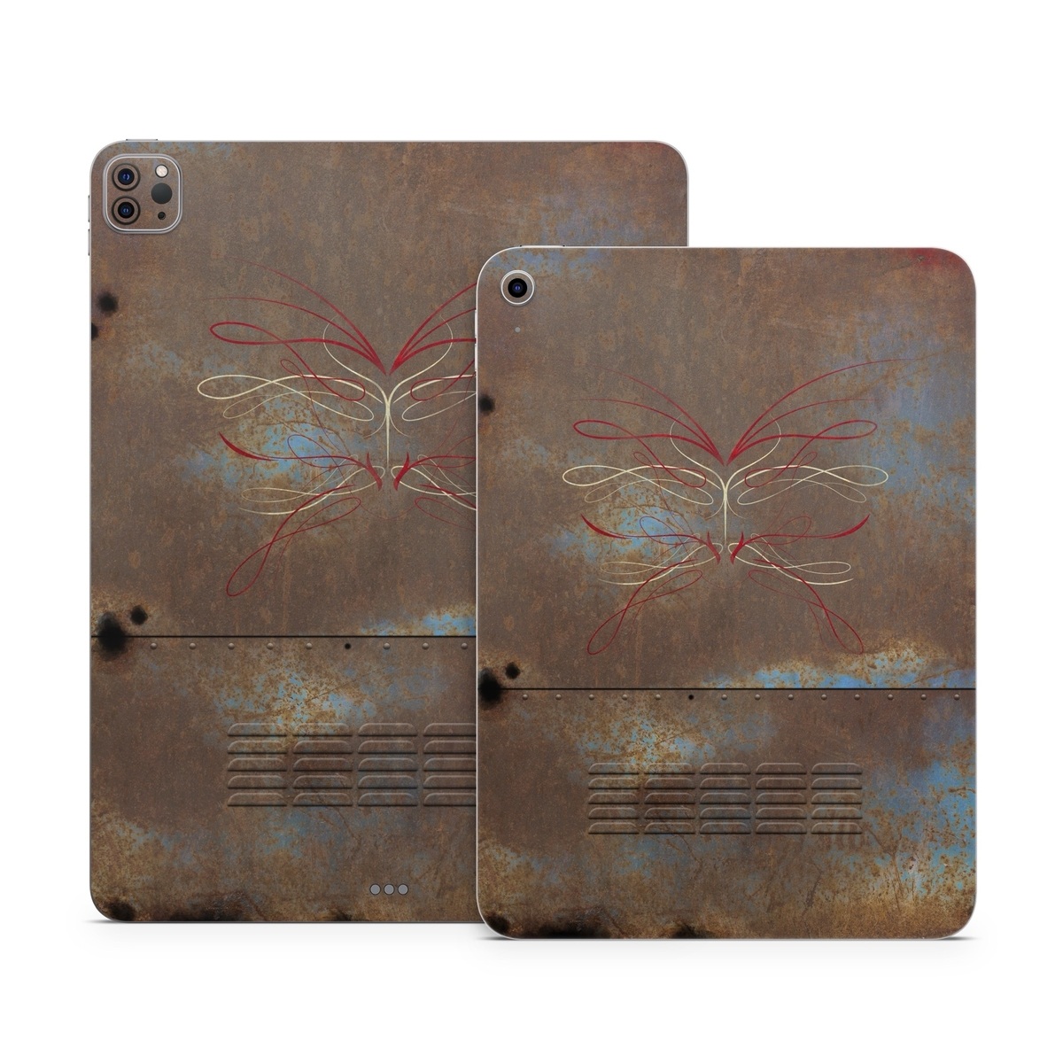 iStyles Apple iPad Series Skin design of Line, Visual arts, Symmetry, Concrete, Tints and shades, Painting, Art, with blue, red, yellow, brown, black colors, and tagged with signs, lookslike, objects, patterns, hotrod, musclecar, ratrod, retro, rust.