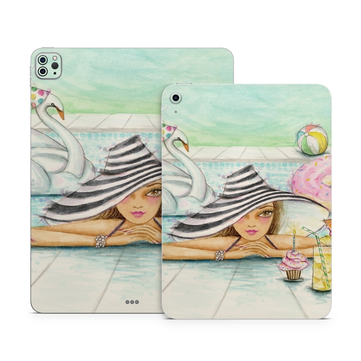 iStyles Apple iPad Series Skin design of Watercolor paint, Illustration, Cartoon, Art, Painting, Drawing, Fictional character, with blue, pink, white, black, brown, red, green, yellow colors, and tagged with people, fineart, objects, animals, urban, drawn, face, faces, fashion, handdrawn, painting, portrait, woman, women, donut, present, cocktail, drink, swan, swimming, ball, cupcake.